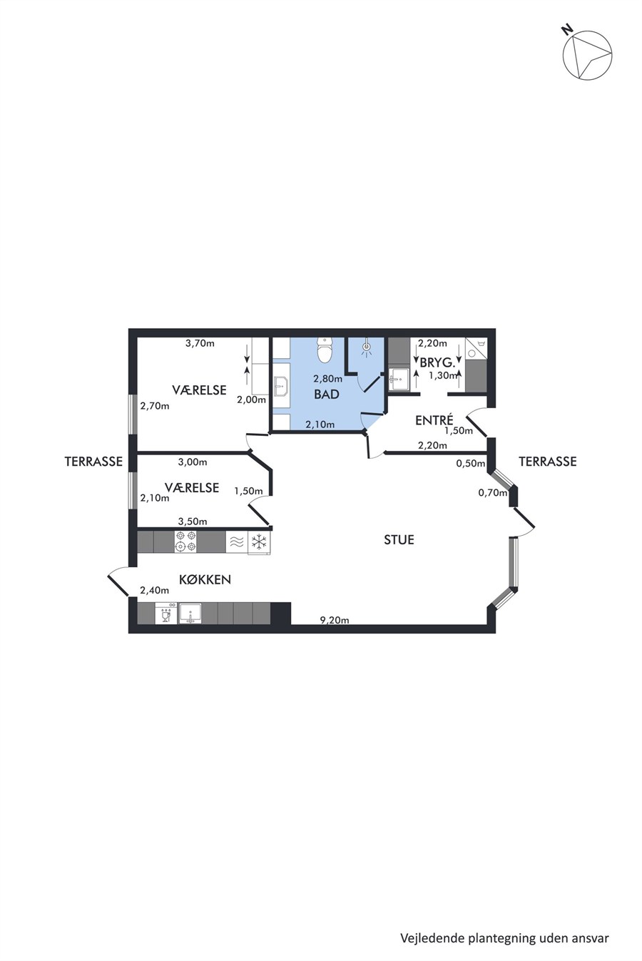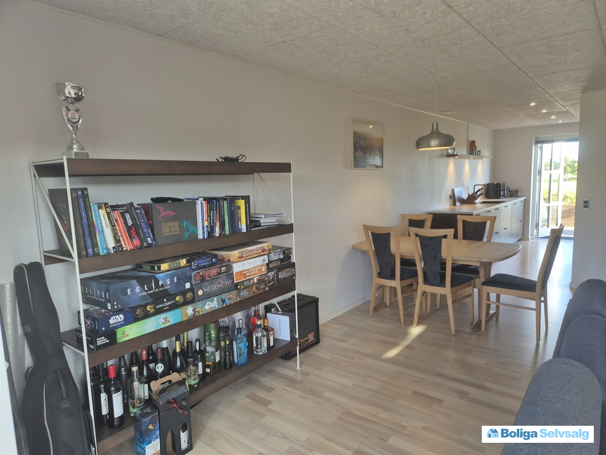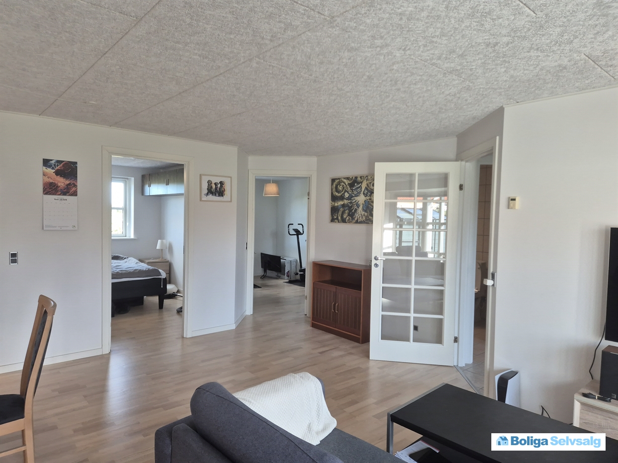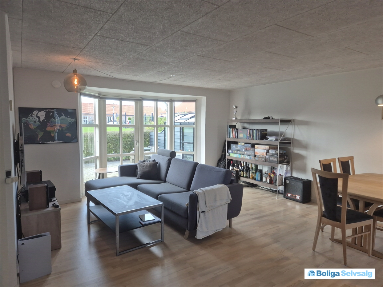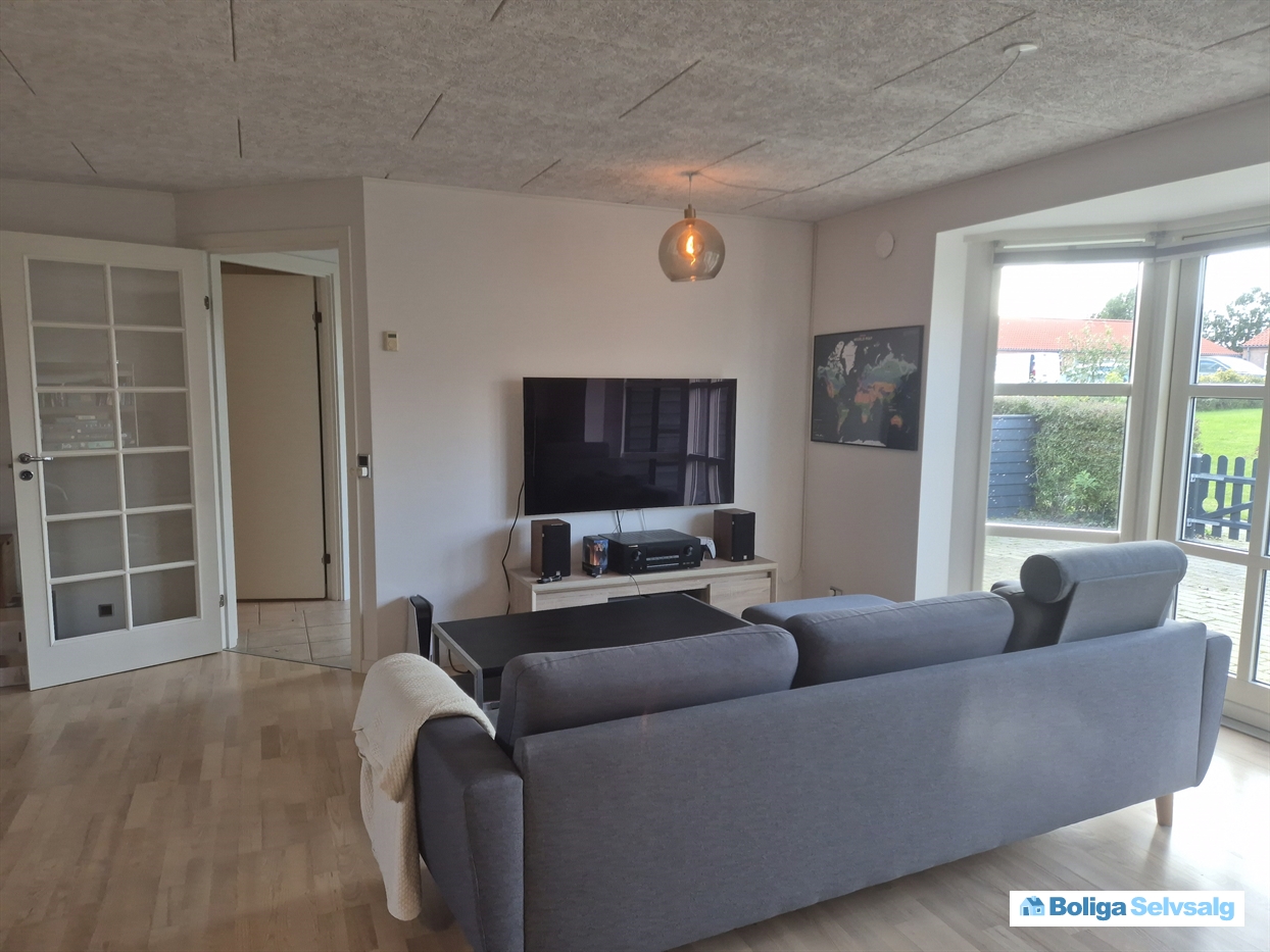 Boligen rummer en stor stue i åben forbindelse med et køkken, et rummeligt badeværelse, praktisk bryggers med vaskemaskine og opbevaring samt to værelser, hvoraf det ene har indbyggede skabe.