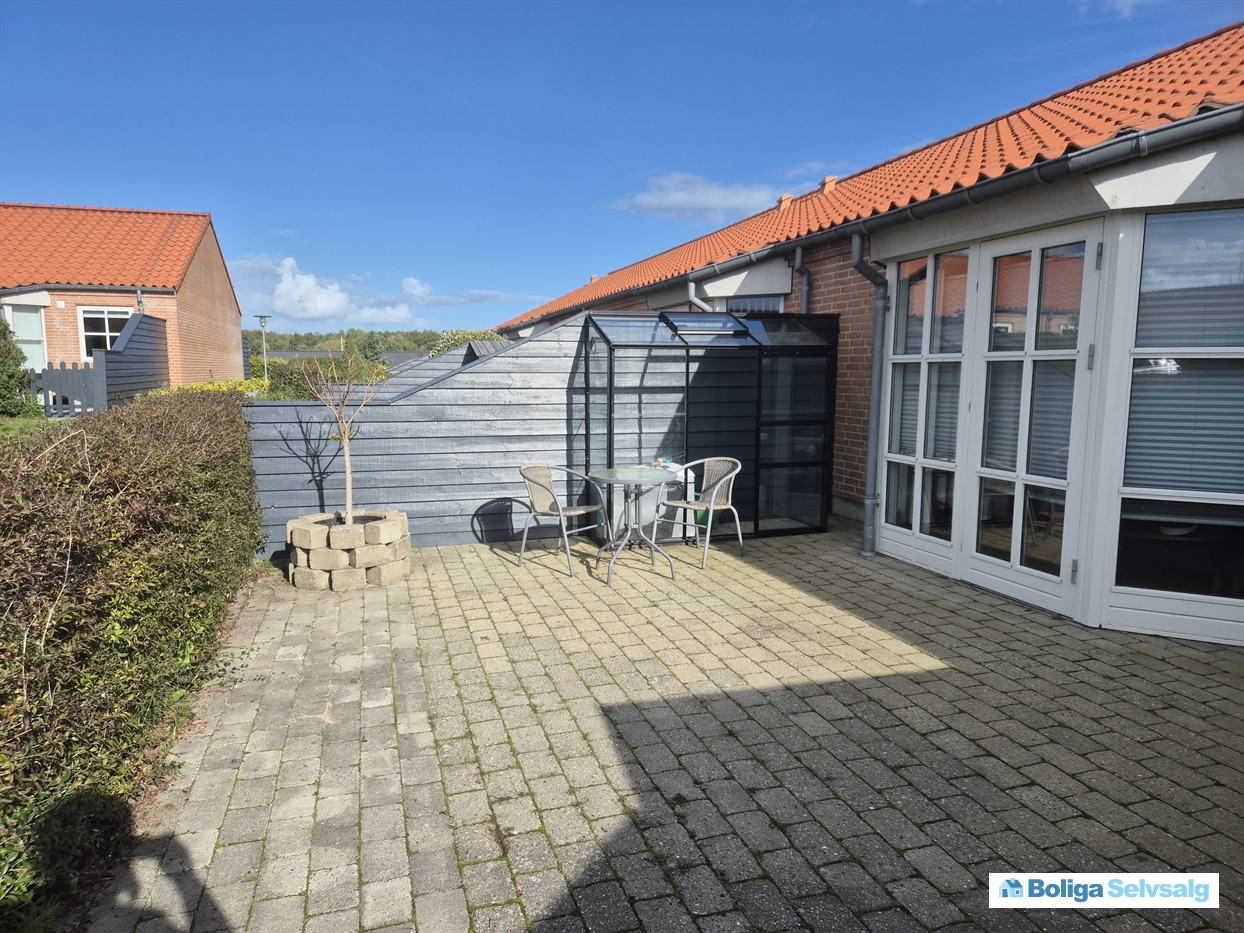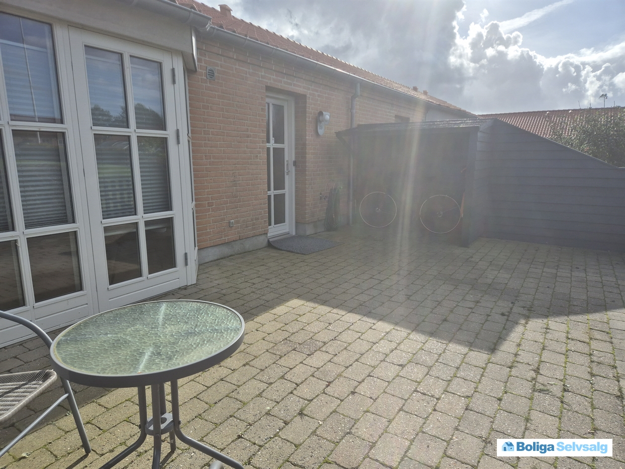 I forhaven er der cykelskur og et lille drivhus, og her er sol om eftermiddagen og aftenen.