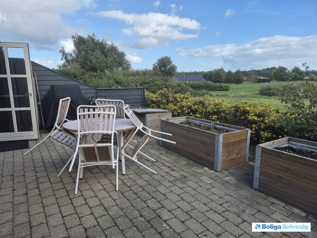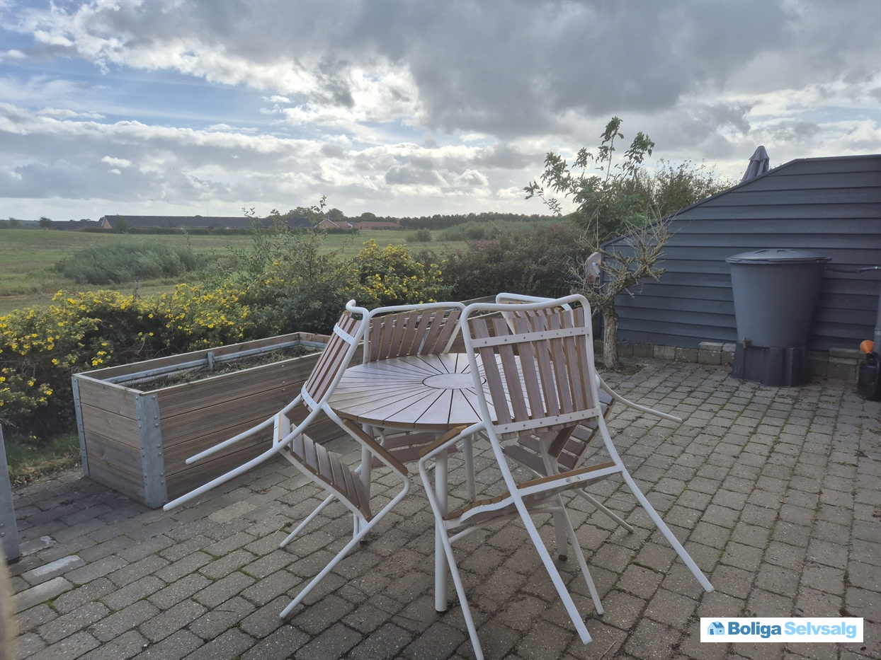 Baghaven grænser op til et stort, åbent område og rummer tre blomsterkasser. Baghaven er udvidet ud over boligens brugsret, hvilket jeg gerne uddyber ved fremvisning.