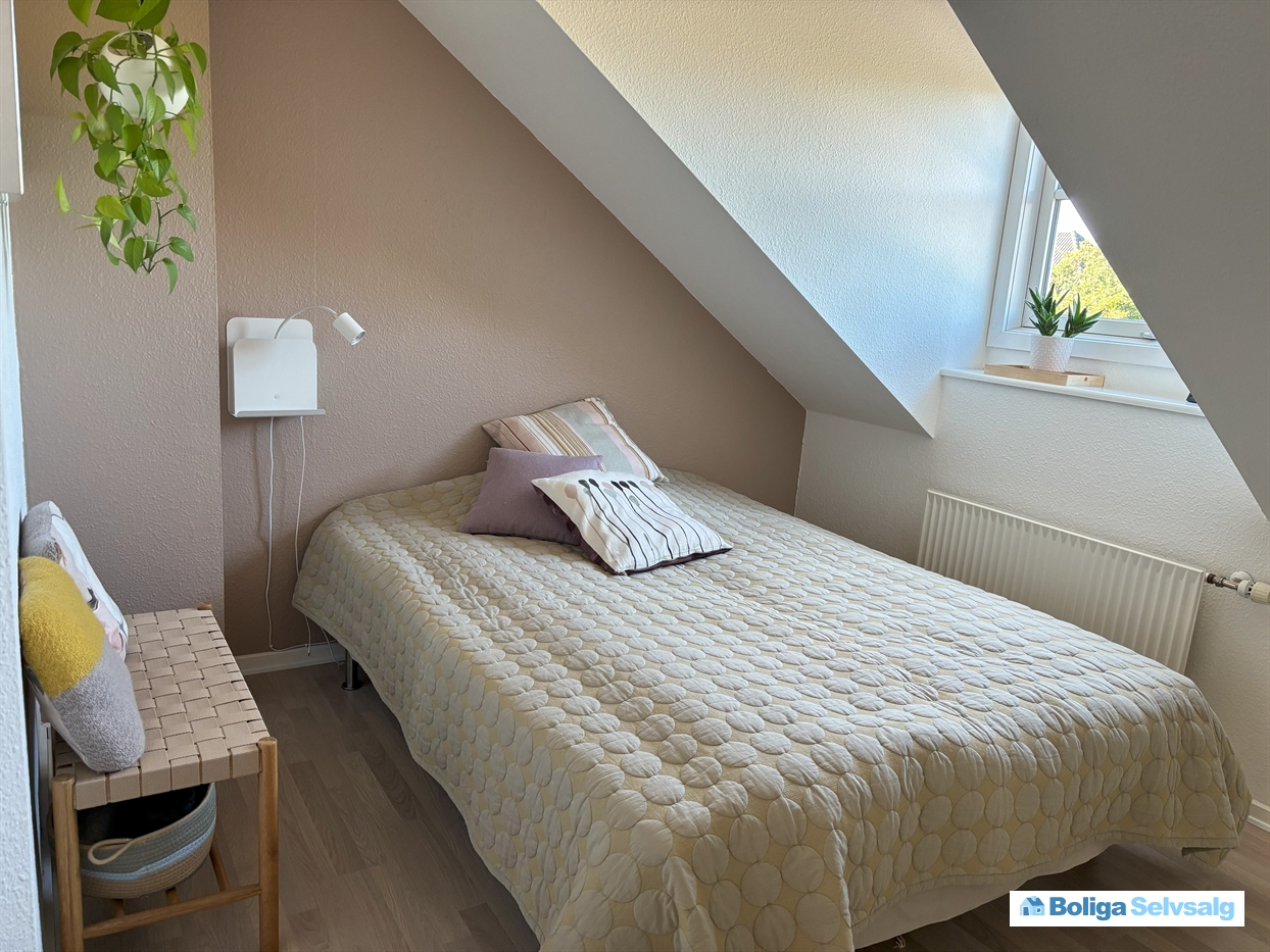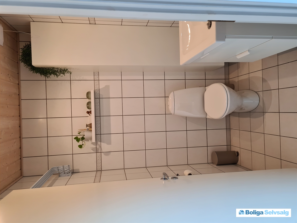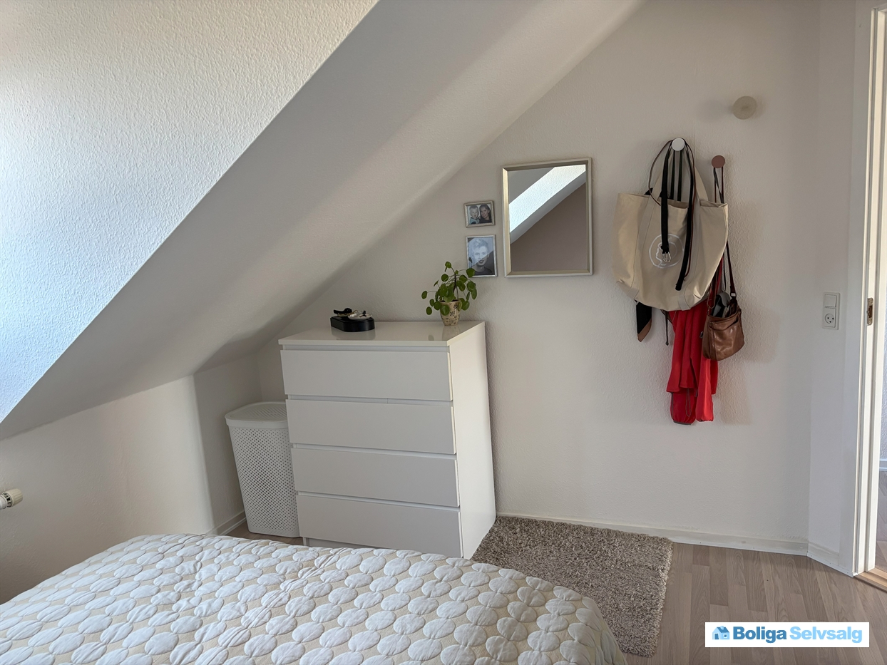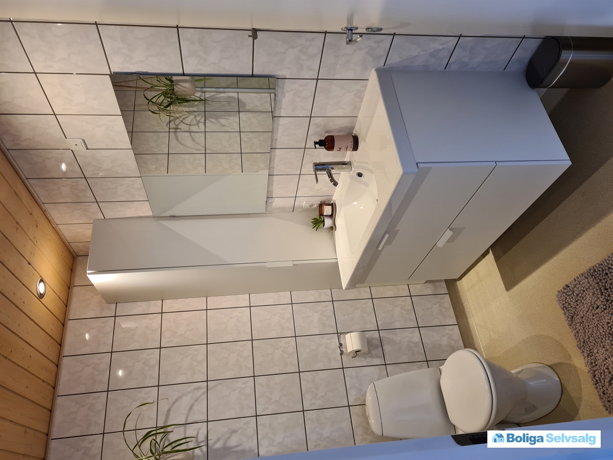 På 1. sal finder man 2 værelser, begge med skabe, dejligt soveværelse og lyst badeværelse med skabs arrangement fra november 2022. Fra repos er der loftlem til godt opbevaringsloft.