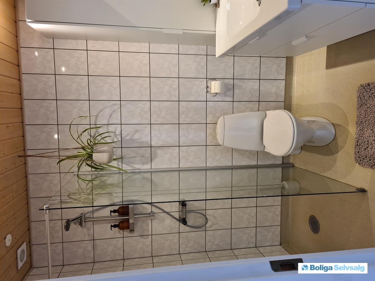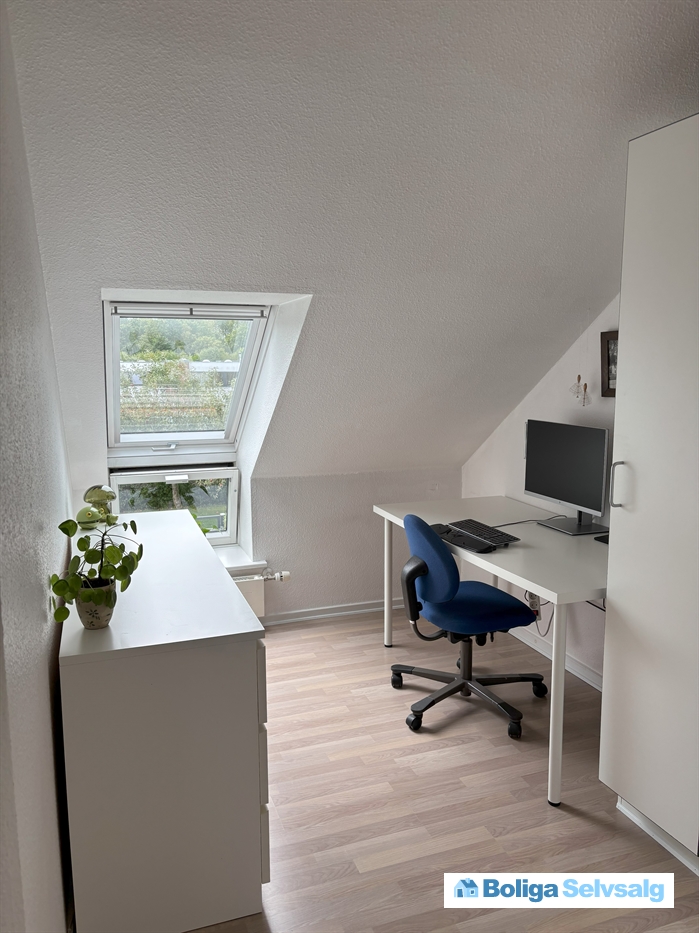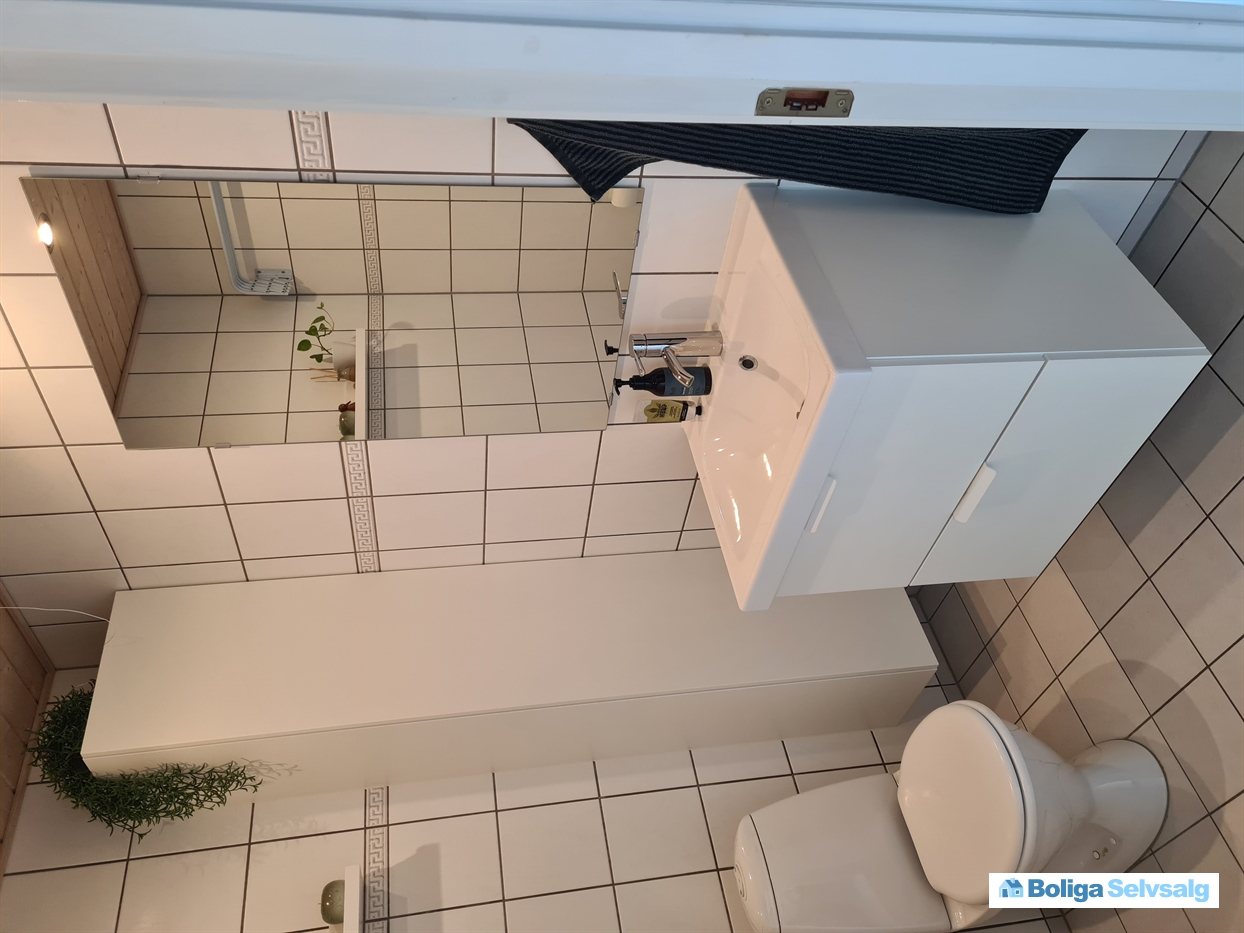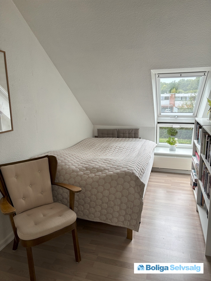 På 1. sal finder man 2 værelser, begge med skabe, dejligt soveværelse og lyst badeværelse med skabs arrangement fra november 2022. Fra repos er der loftlem til godt opbevaringsloft.