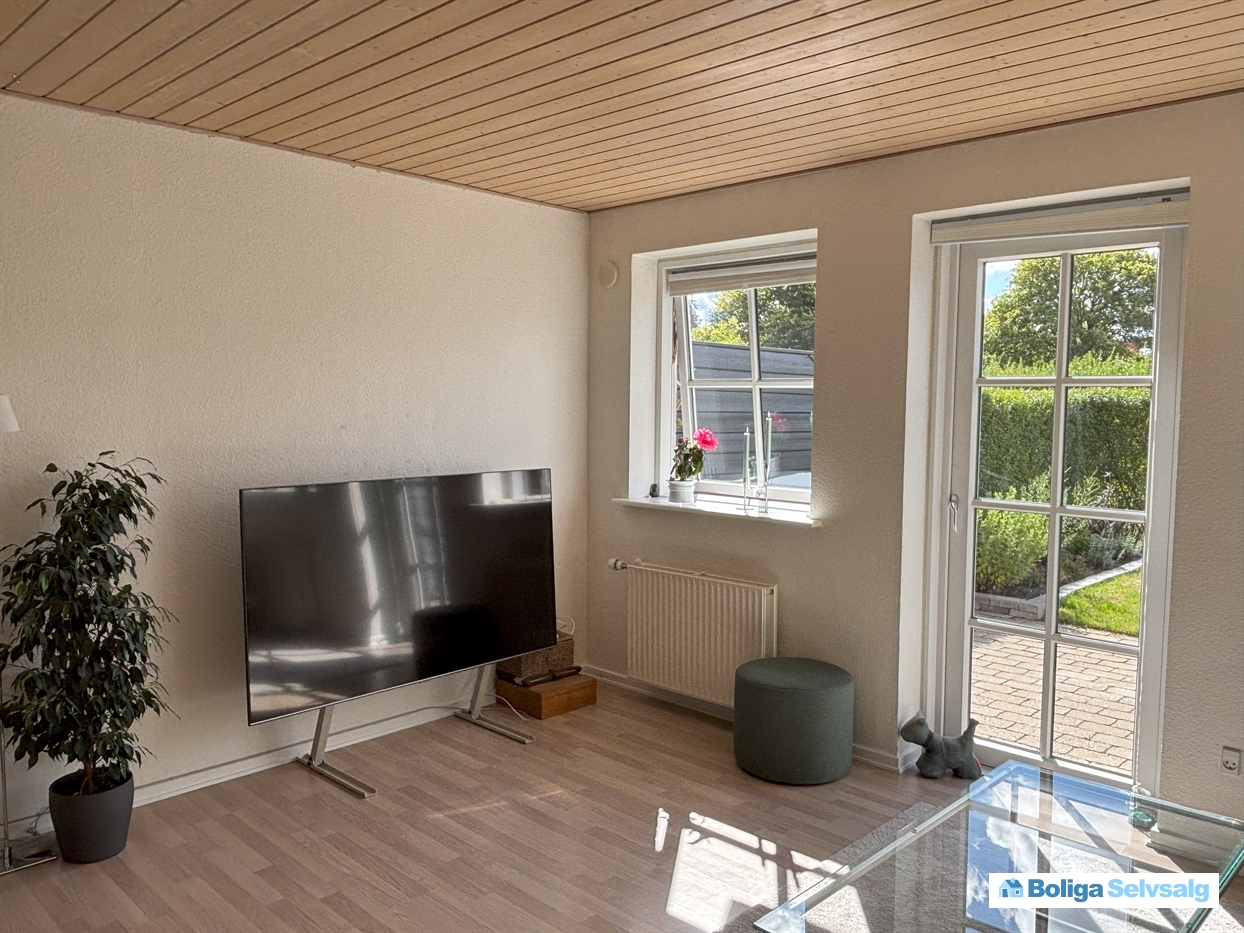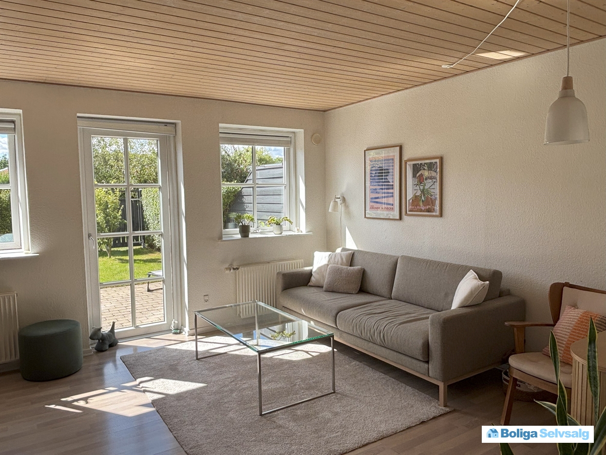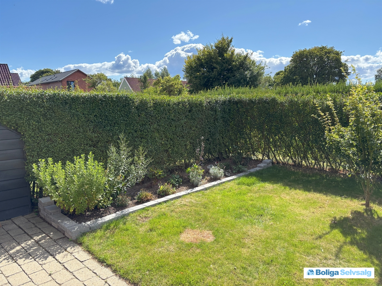 Fra stuen er er udgang til skøn sydvendt, solrig og ugenert have med fliseterrasse, græsplæne og blomsterbed. Der er desuden elektronisk markise.