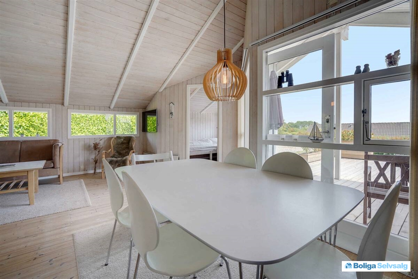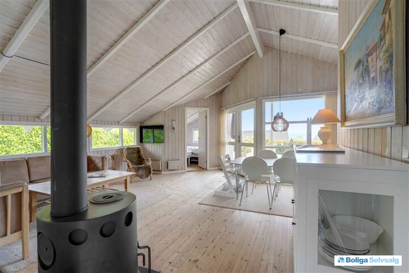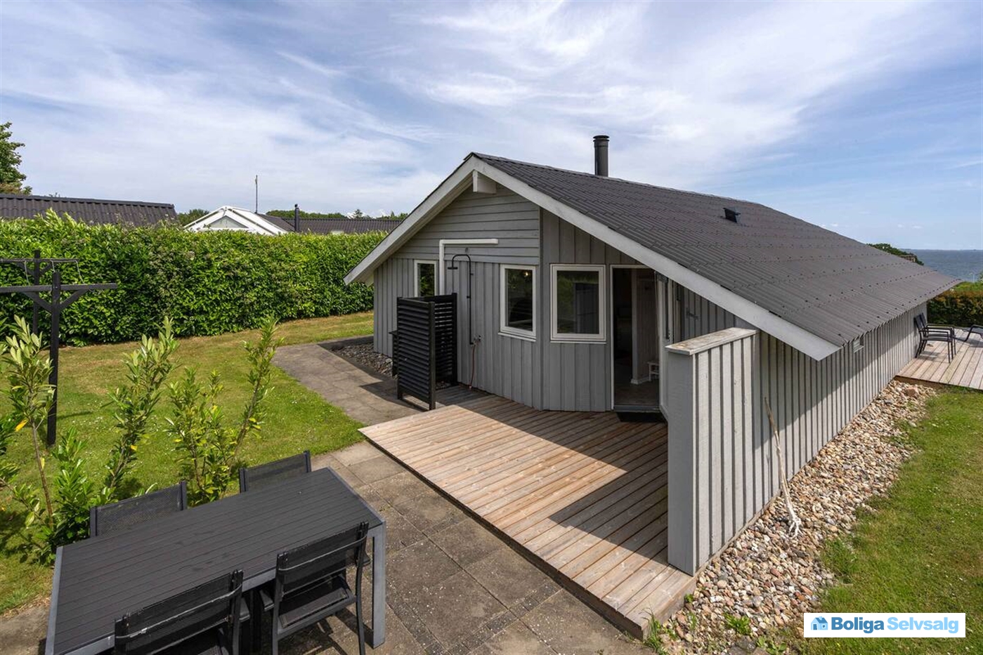 Boligens hjerte er den lyse stue, hvor køkken og opholdsrum smelter sammen i ét. Herfra er der direkte udgang til en sydøstvendt terrasse med udsigt over havet – det perfekte sted at nyde sommerdage og lune aftener. Udenfor finder I også et vildmarksbad, som indbyder til hyggelige stunder under stjernehimlen.