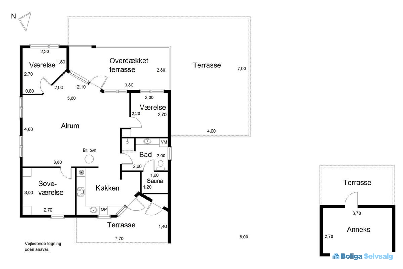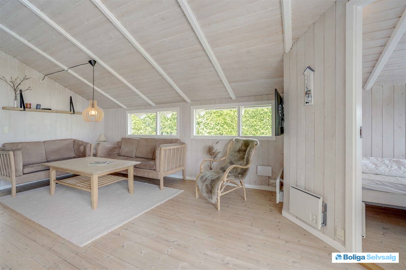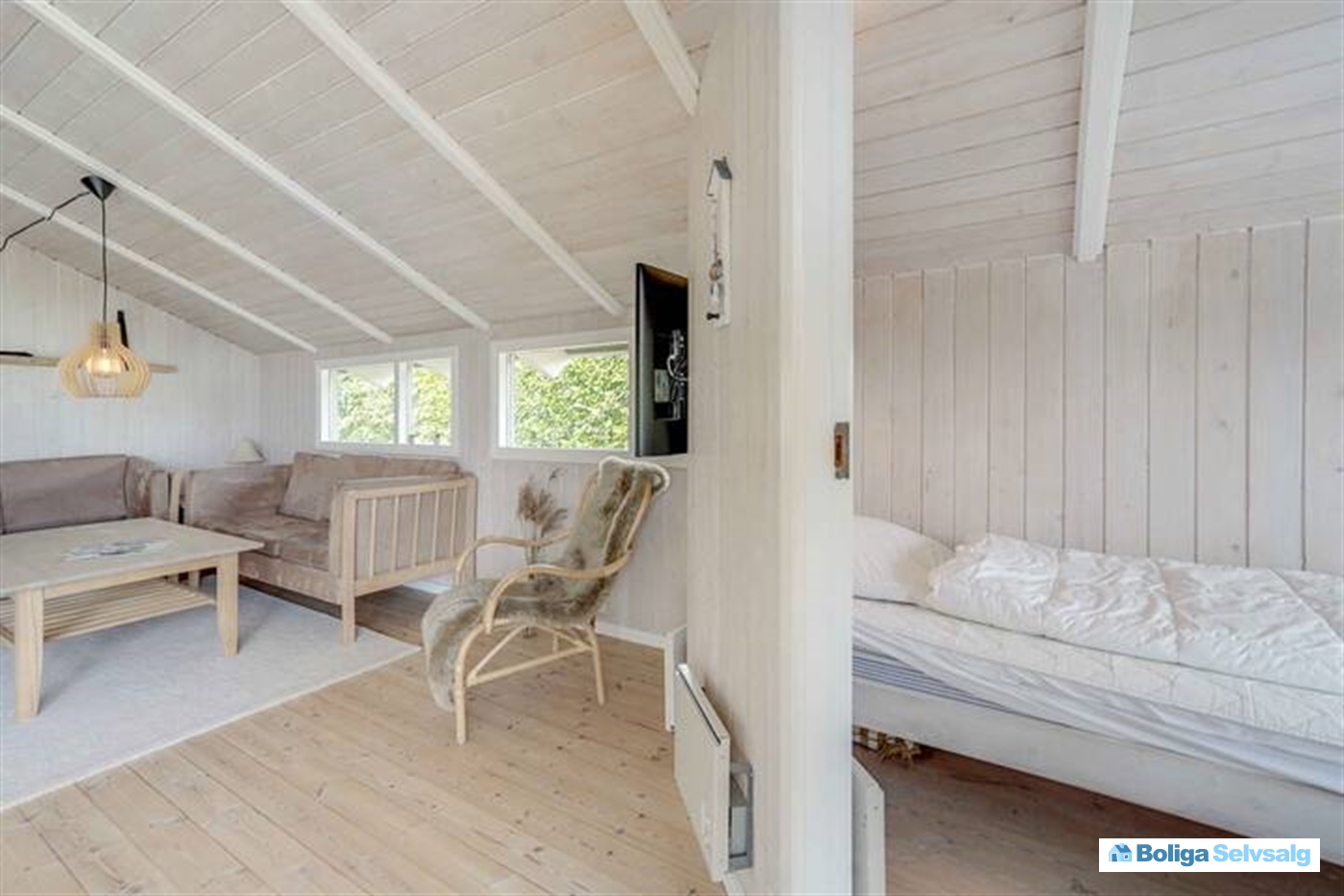 Boligens hjerte er den lyse stue, hvor køkken og opholdsrum smelter sammen i ét. Herfra er der direkte udgang til en sydøstvendt terrasse med udsigt over havet – det perfekte sted at nyde sommerdage og lune aftener. Udenfor finder I også et vildmarksbad, som indbyder til hyggelige stunder under stjernehimlen.