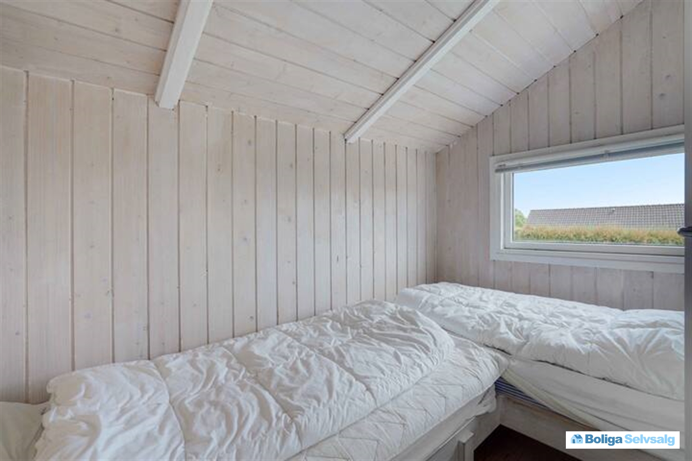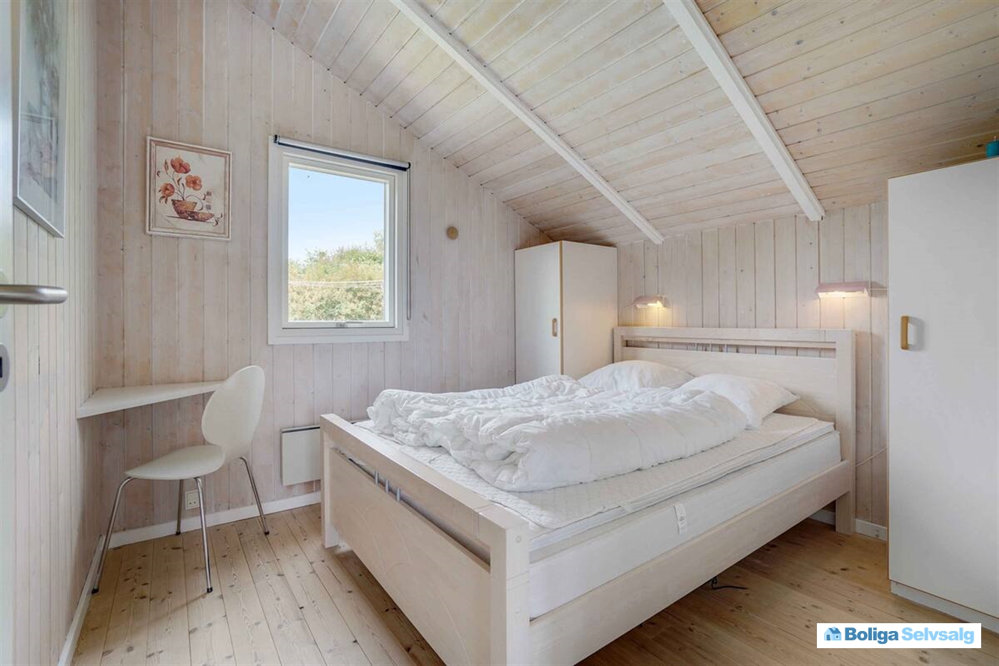 Indretningen rummer et stort soveværelse med dobbeltseng og garderobeskabe samt et badeværelse med bruser og sauna. Derudover to gode værelser med i alt fire sovepladser. Huset har dermed plads til 6 personer og er oplagt til både familiehygge og ferieudlejning.