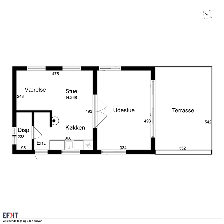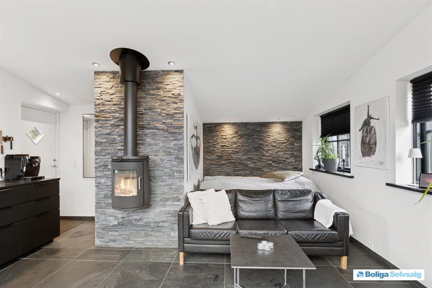 - Rummelig stue med hyggelig væghængt brændeovn, i vinkel til soveplads med dobbeltseng (mulighed for opdeling af skillevæg) og med udgang via de store dobbeltdøre til Orangeriet.