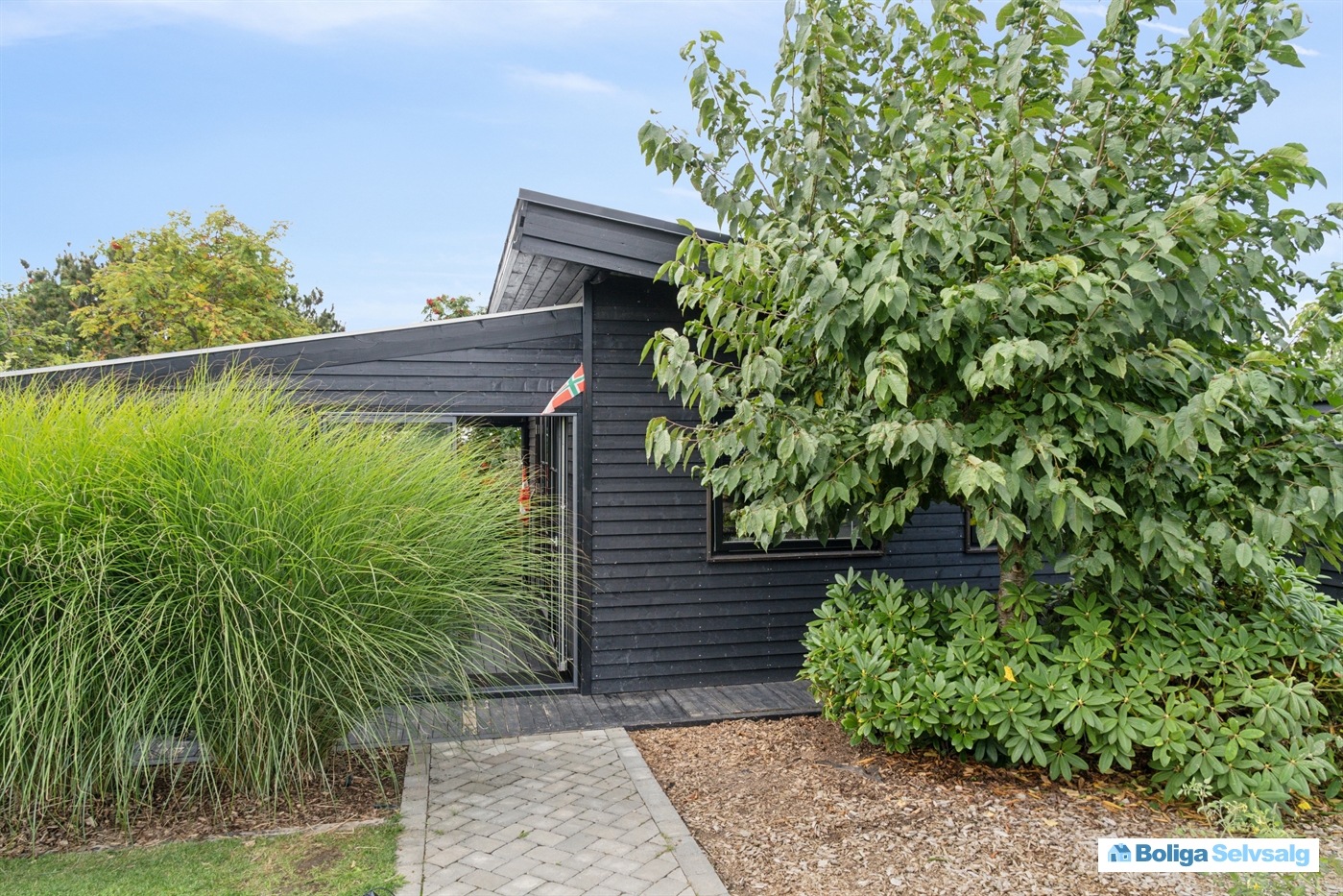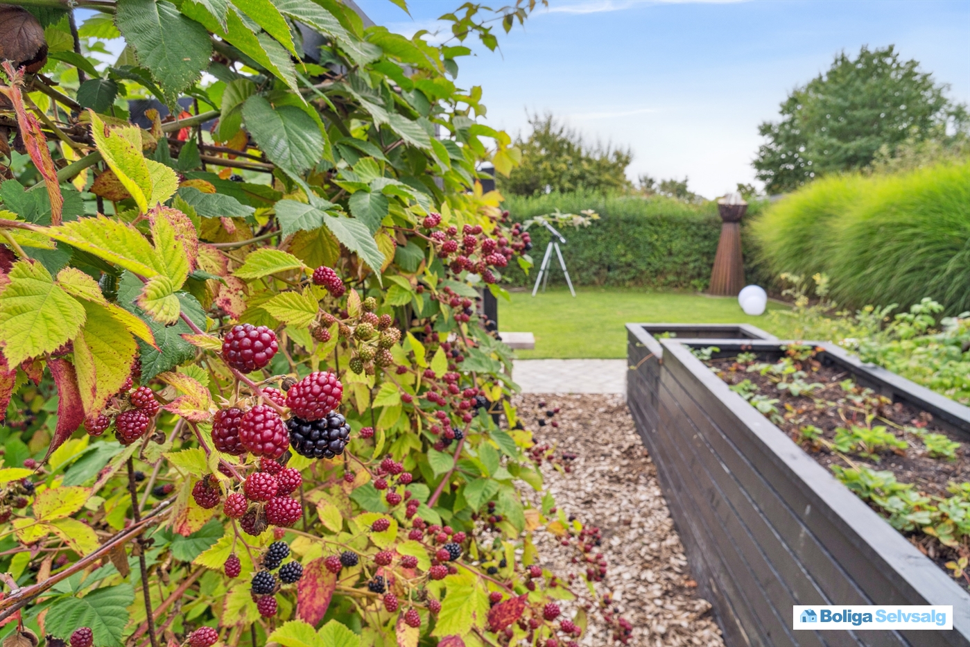 Hertil byder fritidsboligen på et vestvendt og flisebelagt indgangsparti fra fællesarealet af, indrettet med hyggeplads til bord og stole, mulighed for ekstra udekøkken, bokse til opbevaring, brændeplads og indgangsdør til hovedhuset, den vestvendte og UGENERTE træterrasse med et skønt æbletræ plantet i midten og den Japanske siv som grænse til forhaven samt den nem holdte forhave med med mindre græsplæne passet af den medfølgende robot-plæneklipper, smukke staudebuske, flere frugttræer herunder pære, æbler og figentræer, højbede til jordbær mm. Espalie til havens store og VELSMAGENDE brombær samt en SMUKT flisebelagt sti af Herregårdssten direkte til Orangeriet.