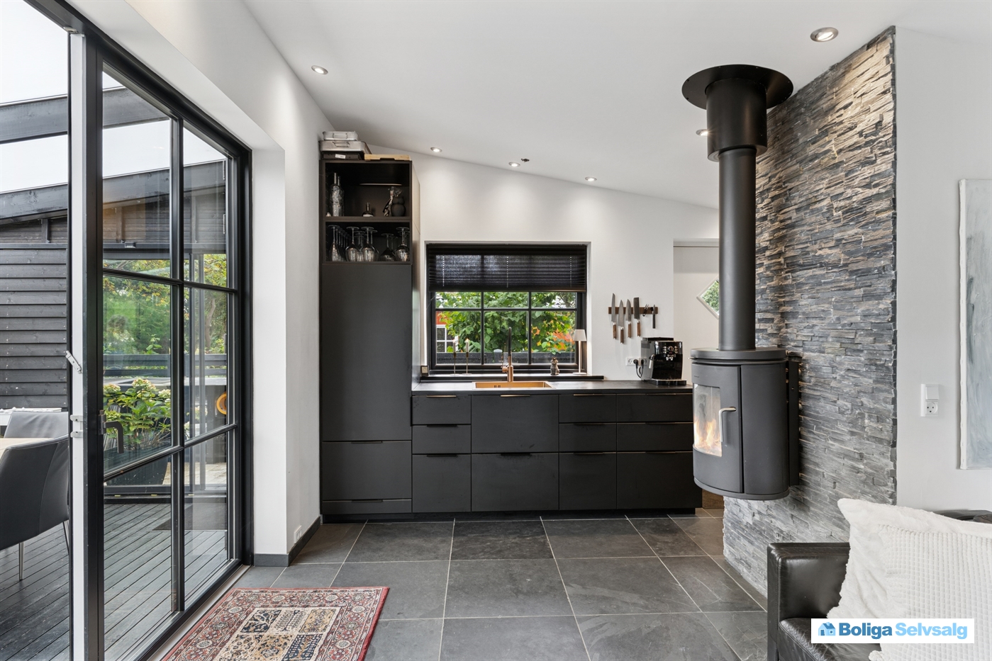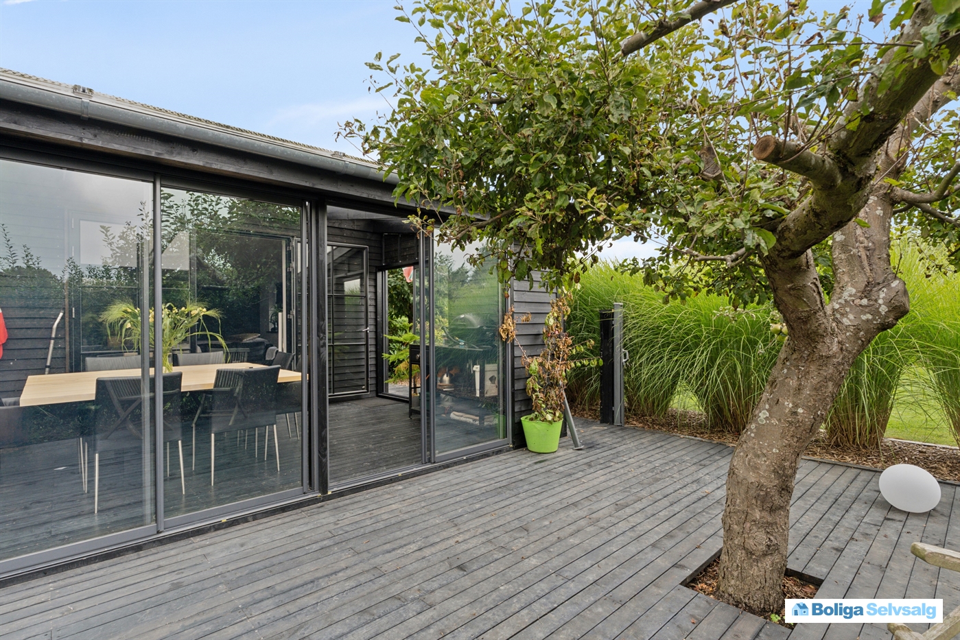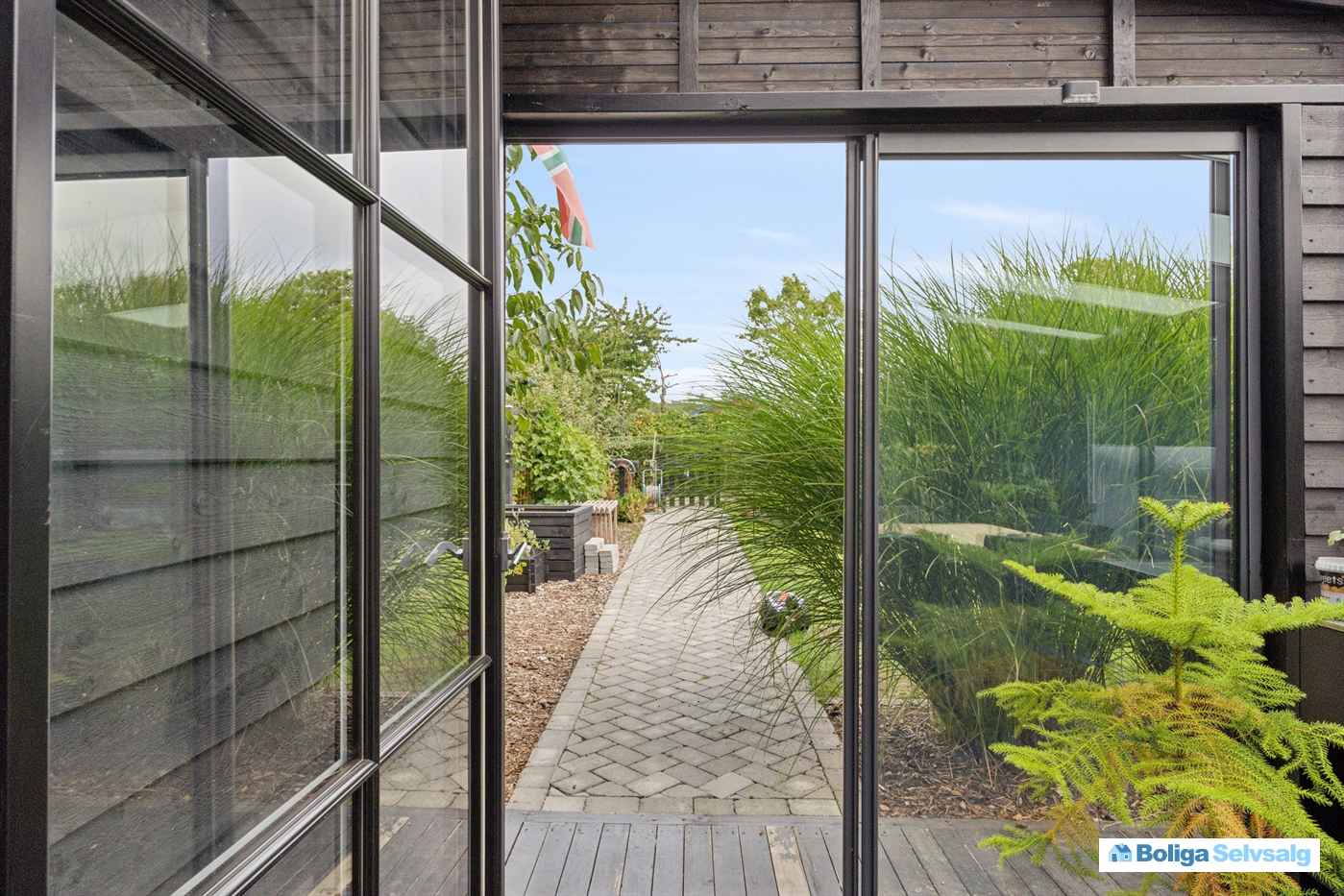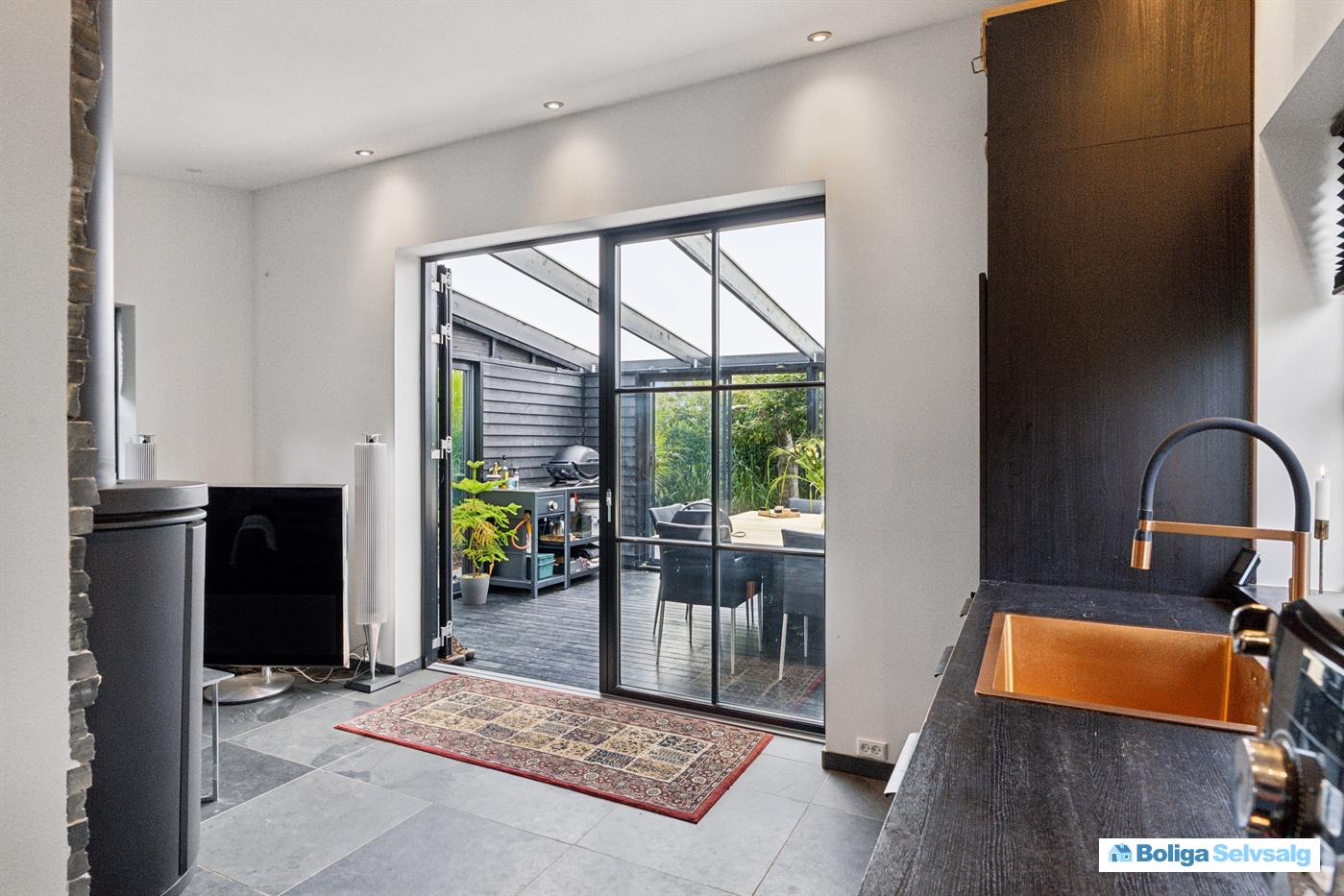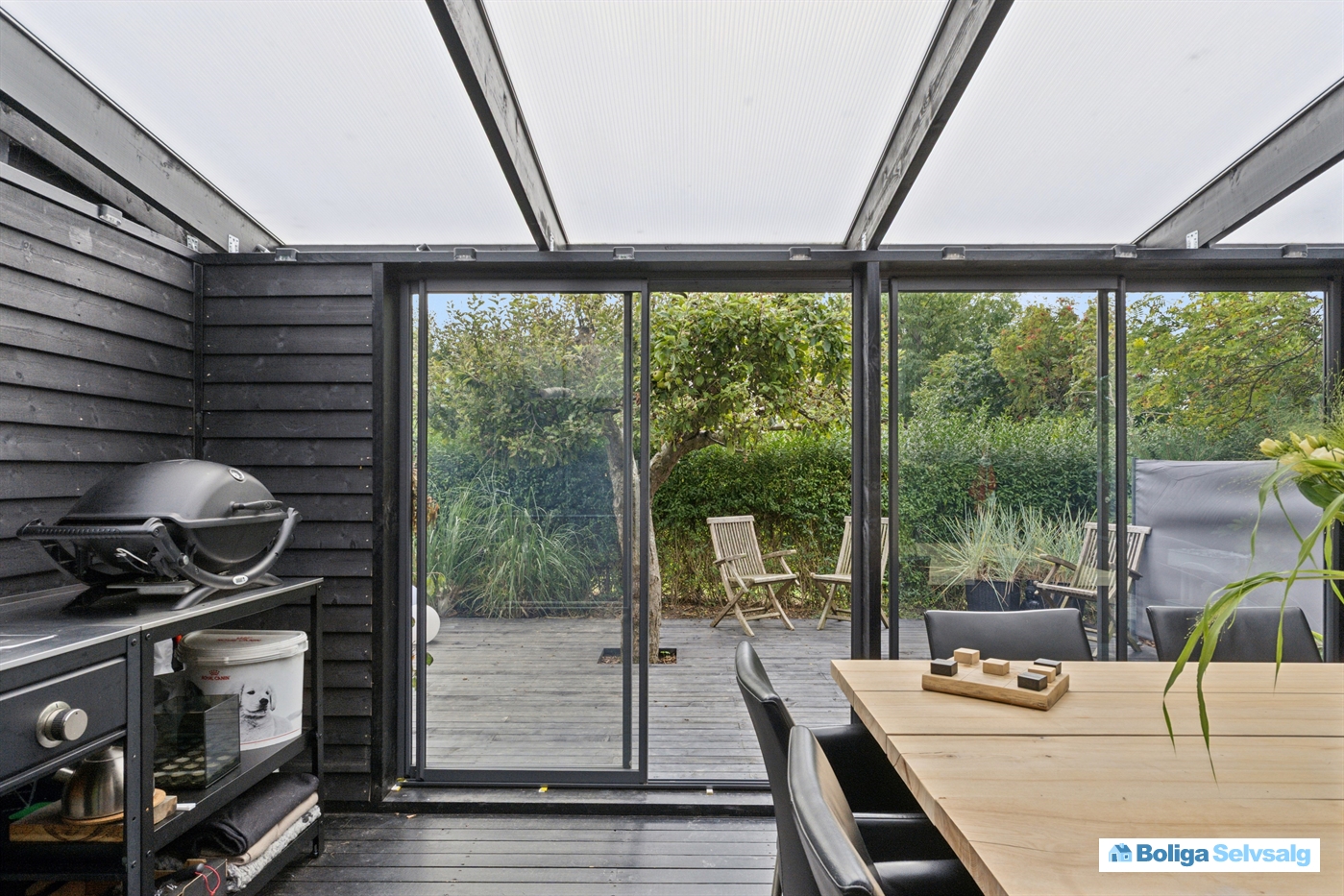 - Huset´s "HJERTE-RUM" er det 20 m2 store Orangeri med udekøkken, KÆMPE speciel designet plankebord med plads til 8 personer, et UNIKT lysindfald fra de store glaspartier og med hele 3 udgange, -til forhaven, det flisebelagte gænge og til den UGENERTE og sydvendte træterrasse.