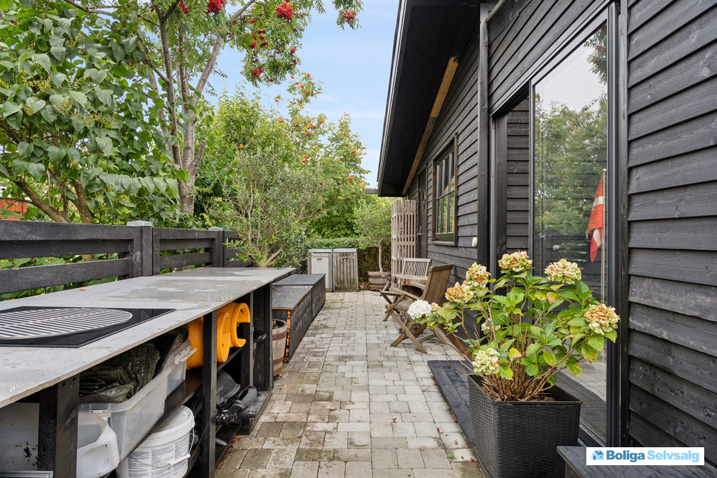 - Overdækning med udendørs badefaciliteter med bruser, opbevaringsplads til værktøj og haveredskaber samt teknikrum til solcelle anlægget.