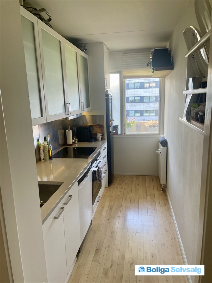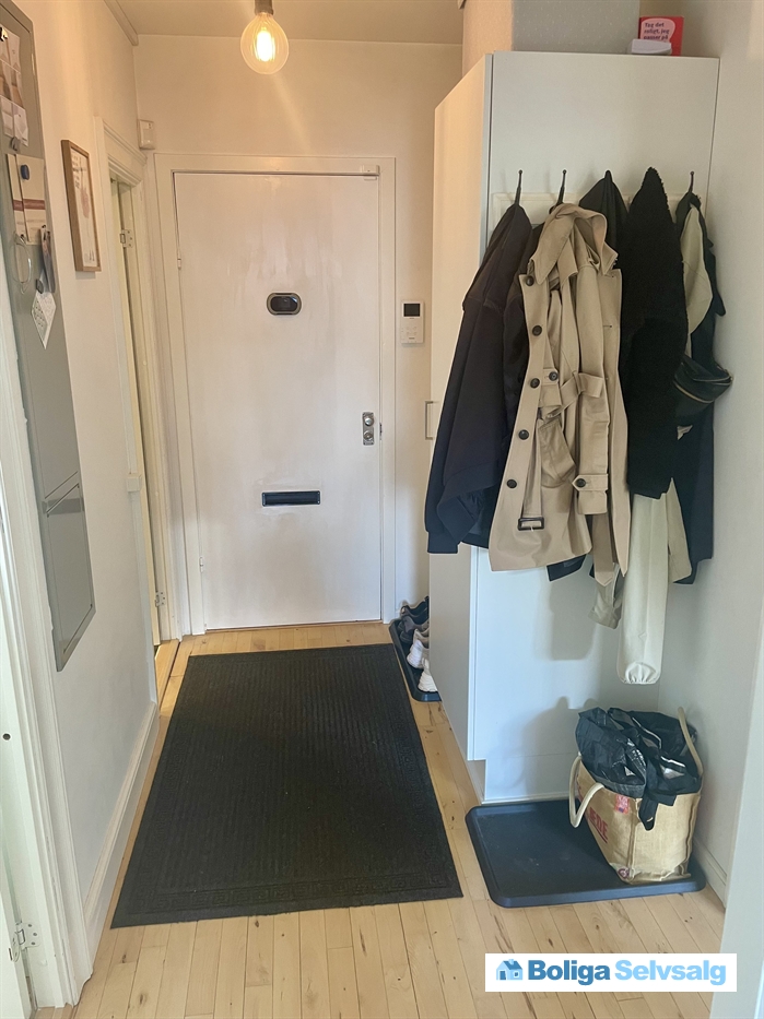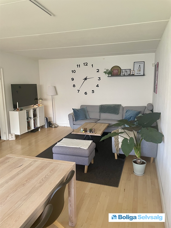 Når du træder ind, mødes du af en rummelig fordelingsgang, der giver adgang til alle lejlighedens rum. Den åbne stue har god plads til både sofa- og spiseområde og fungerer som boligens naturlige samlingspunkt. Køkkenet er klassisk og funktionelt indrettet med god opbevaringsplads.