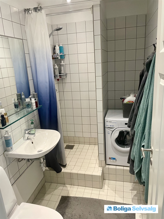 Badeværelset fremstår lyst og tidløst med hvide fliser, separat bruseniche og egen vaskemaskine – en praktisk og komfortabel løsning, der gør hverdagen lidt nemmere.