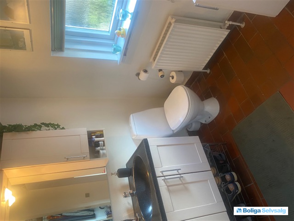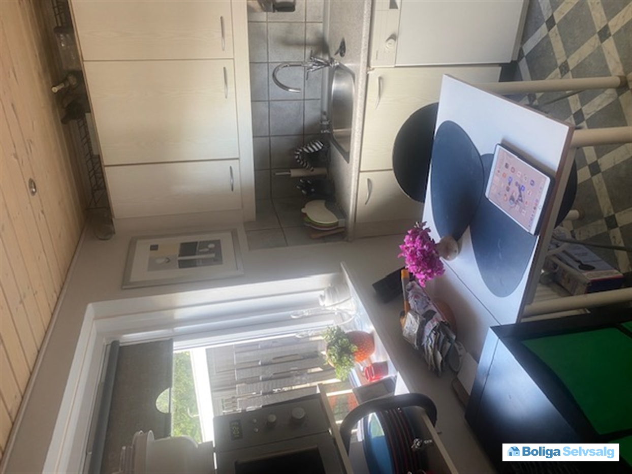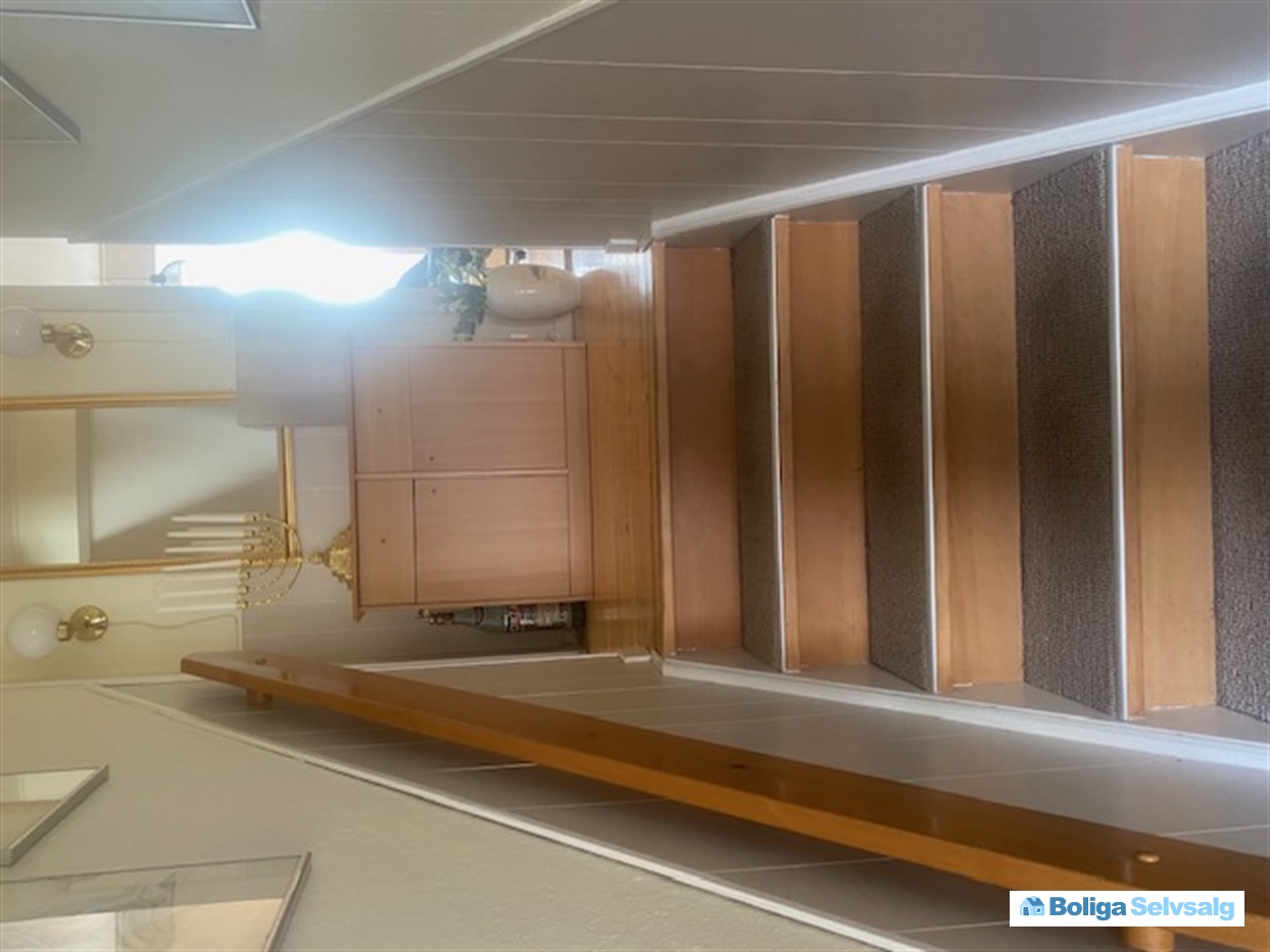 Indvendig står boligen som oprindelig. Kvadratmeterne har en spændende fordeling og indh: Entre, til venstre køkken med lille spiseplads, til højre er badeværelse med stor bruseniche, vaskemaskine. Trappe til første sal med soveværelse med skabsvæg og et værelse.