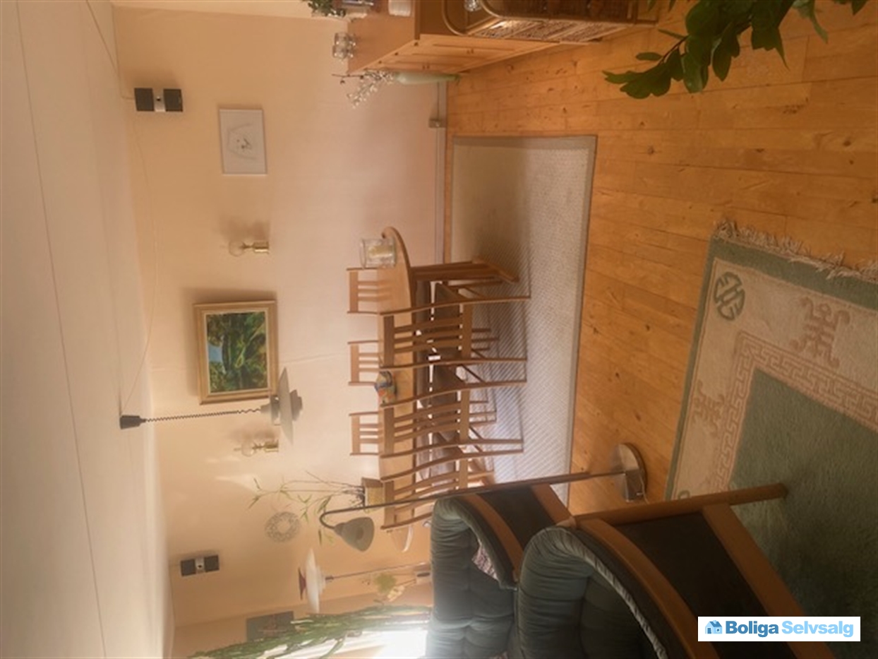 Fra entreen ligeledes trappe ned til stor spise/opholdsstue med trægulv. Stort lyst vinduesparti til lille overkommelig have med flisebelagt terrasse.