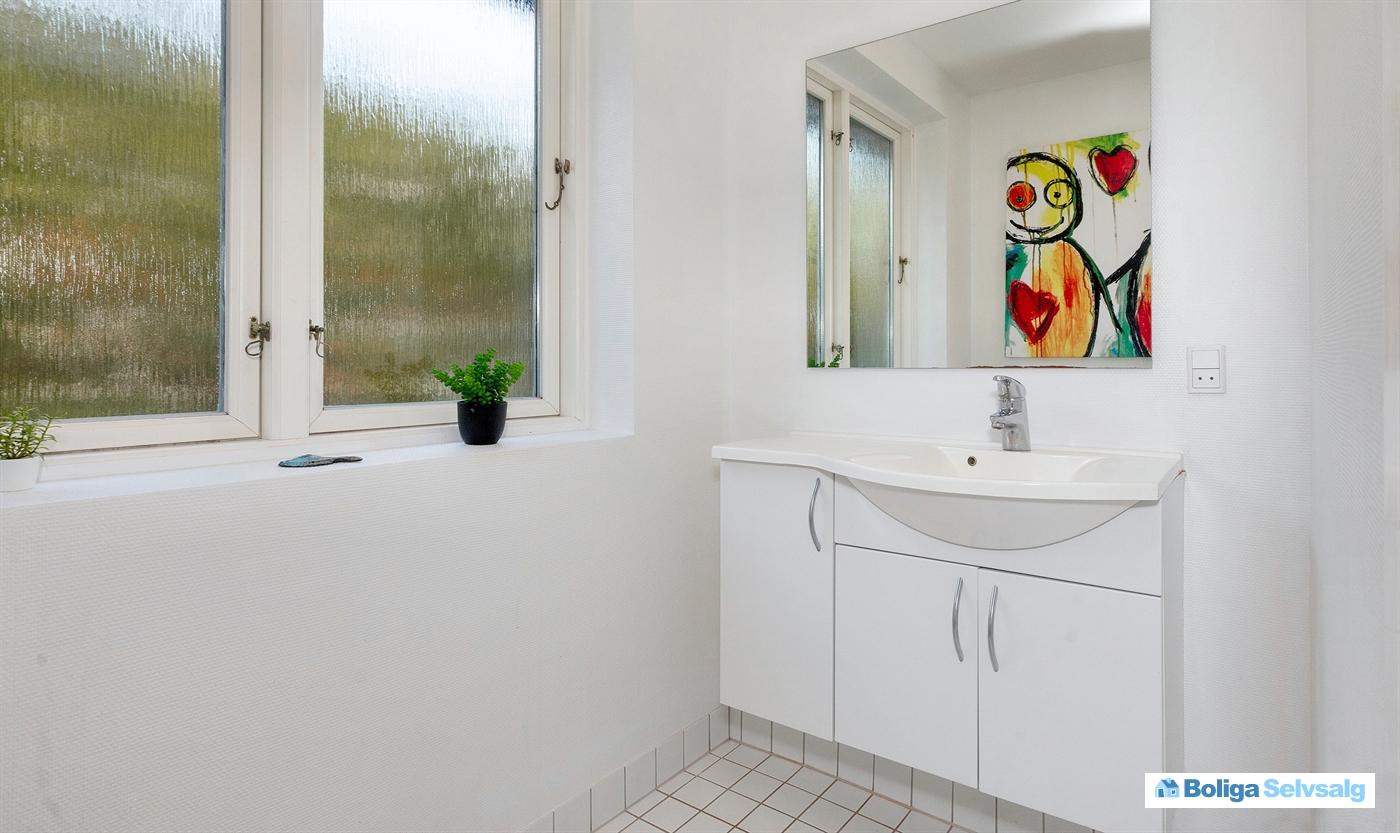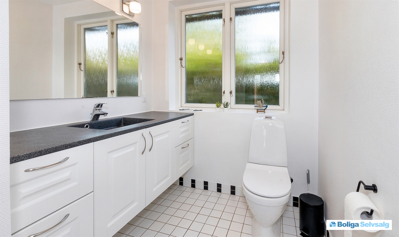 Lyst badeværelse med bademiljø, toilet samt bruser. Gæstebadeværelse med toilet. Derudover er der vaskemaskine og tørretumbler i huset.
