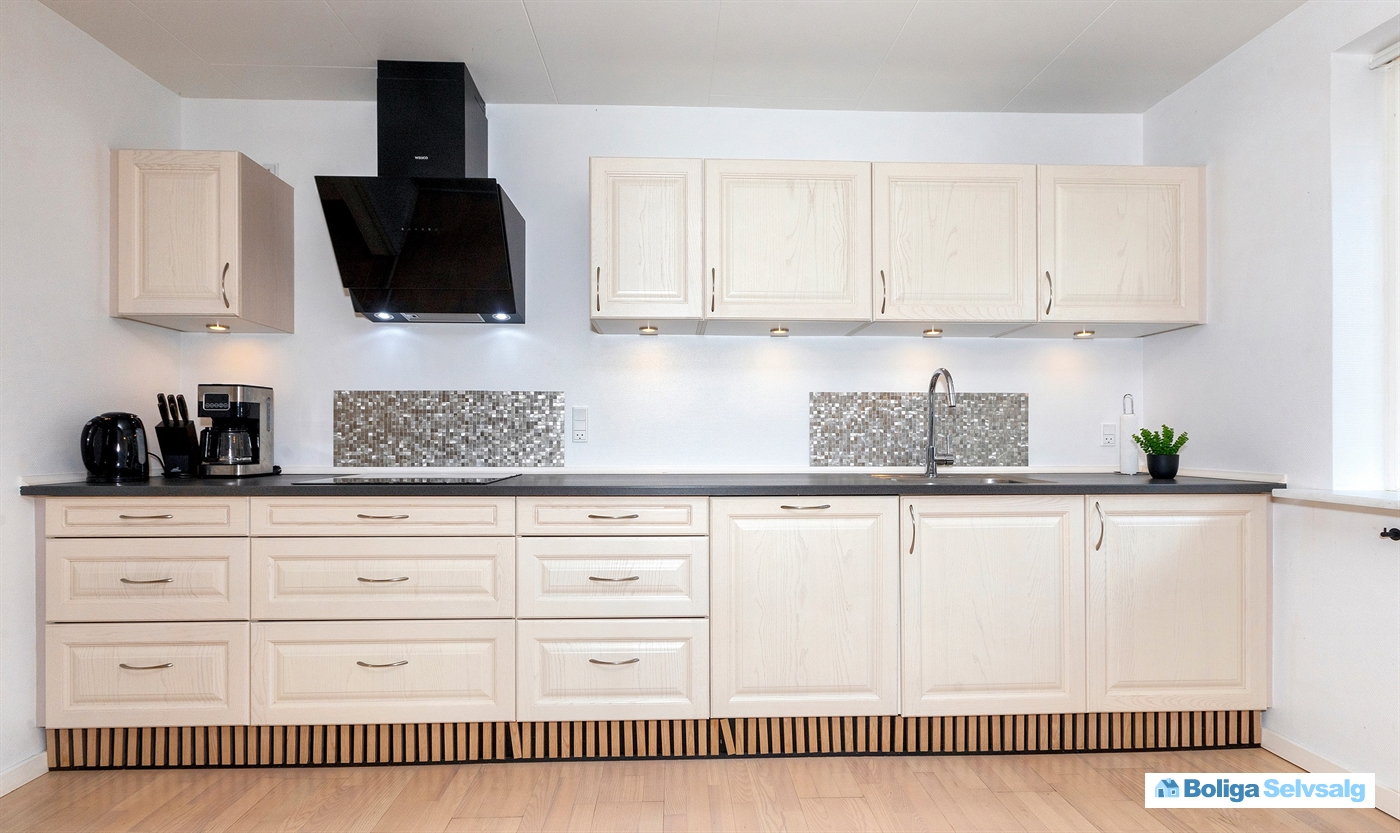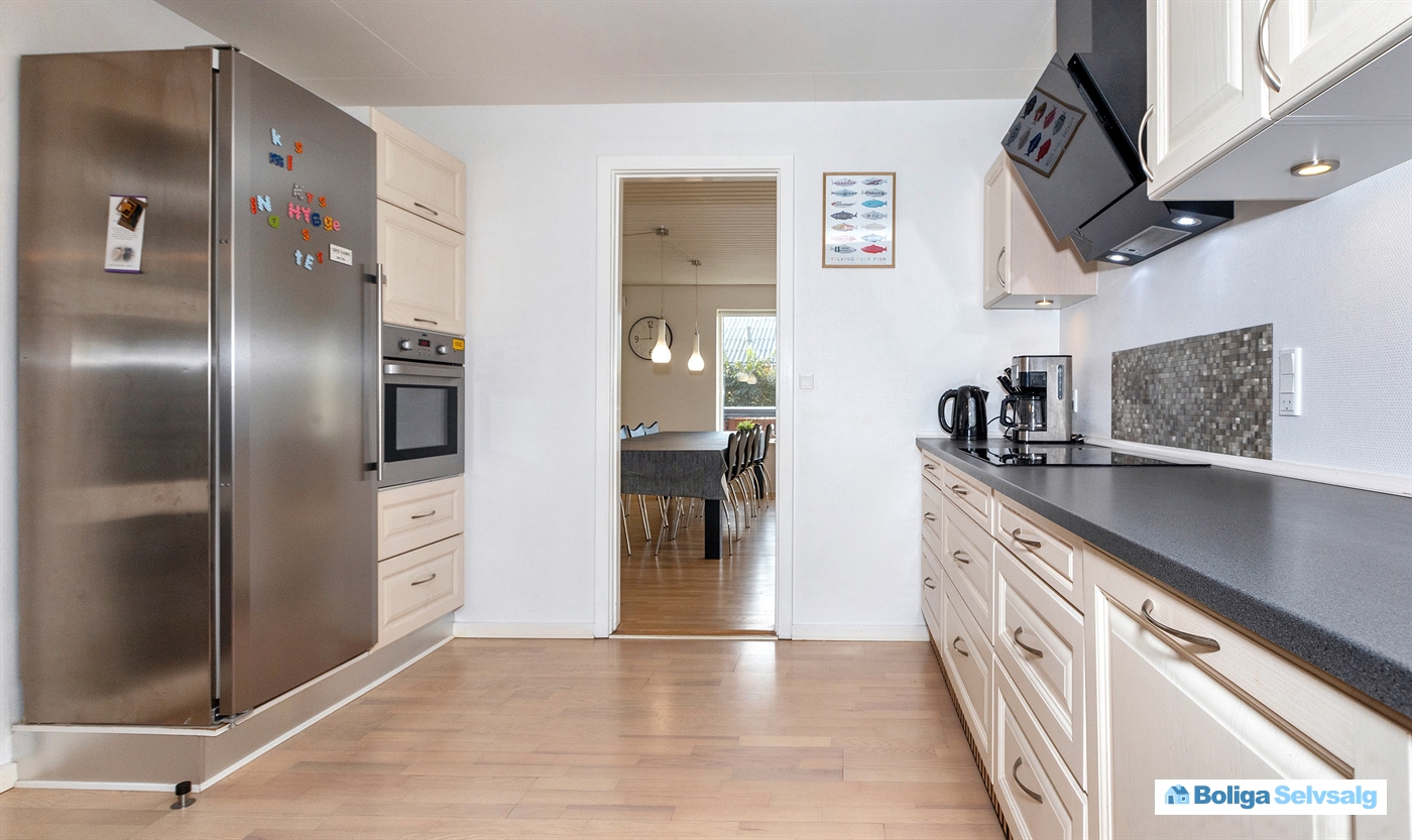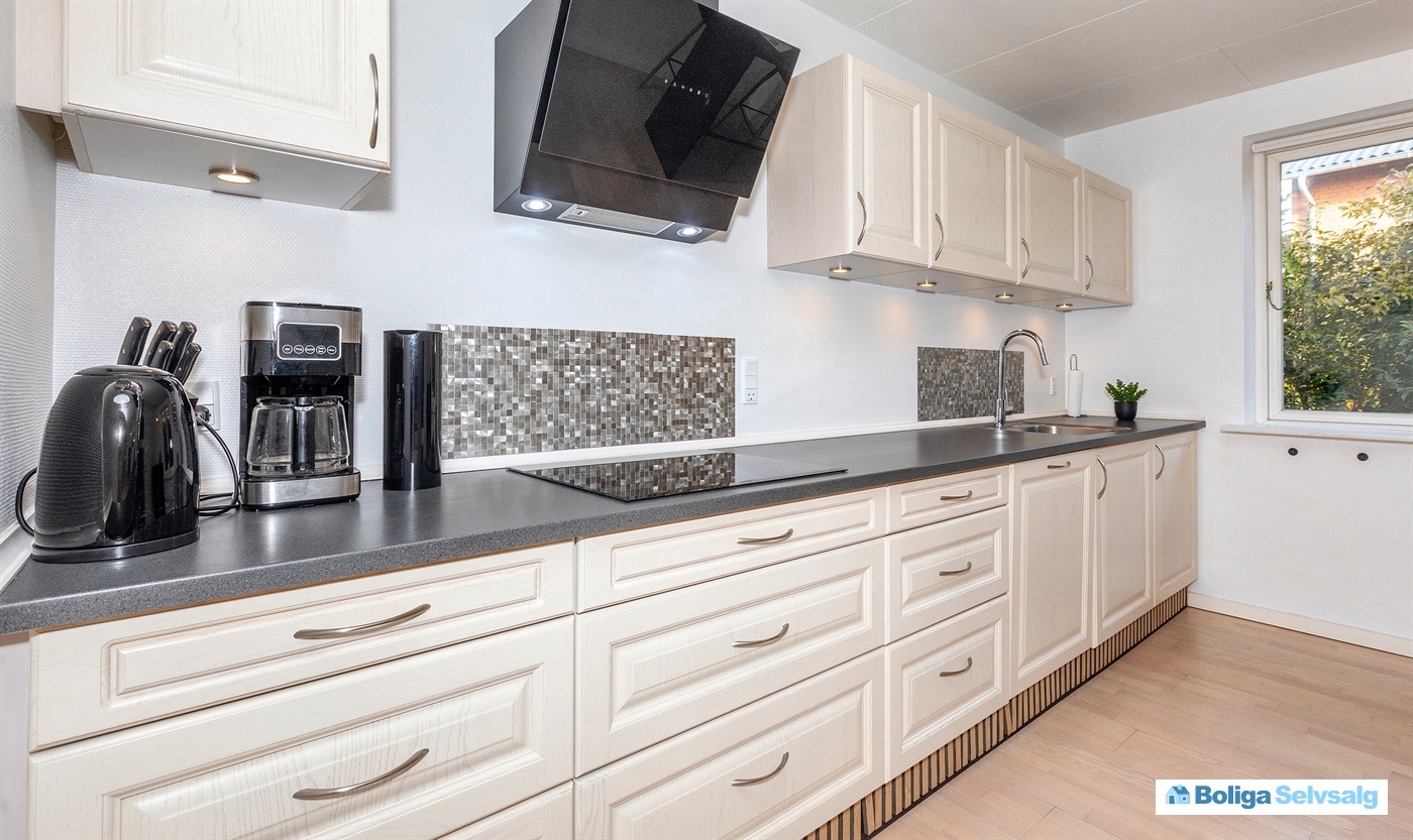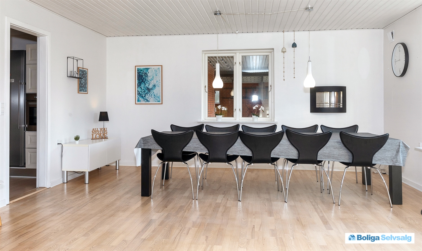 Huset fremstår generelt lyst og indbydende. Huset er godt og praktisk indrettet med kombineret køkken/alrum/stue.
