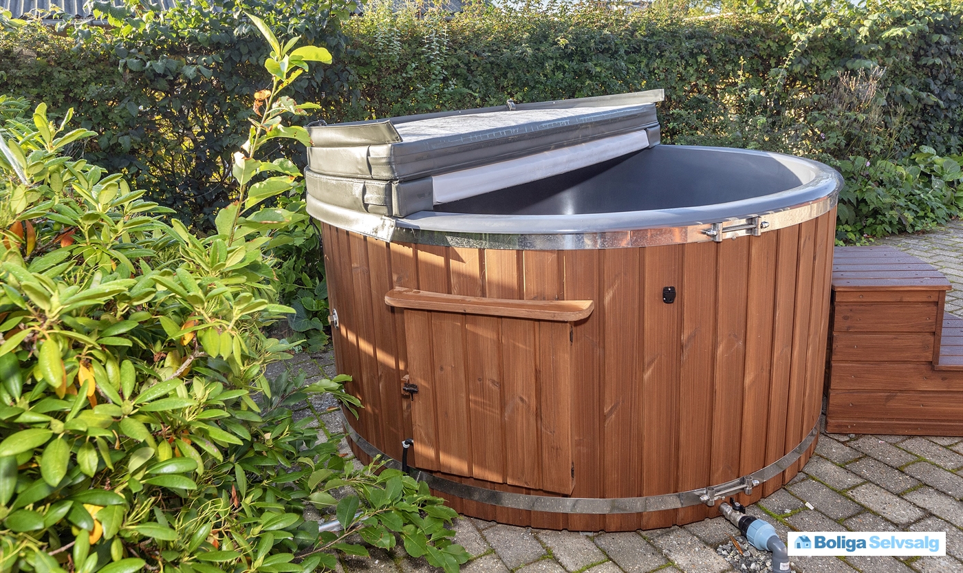 Huset byder udvendigt på en stor og dejlig terrasse, der både er åben og overdækket. Her kan I nyde aftensmaden, eller et glas vin mens solen går ned over området. Det er også på terrassen husets 6-personers Vildmarksbad findes.