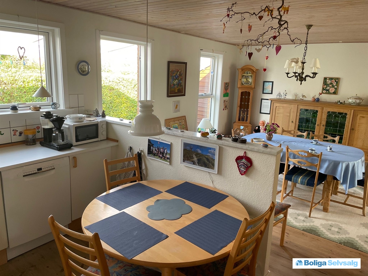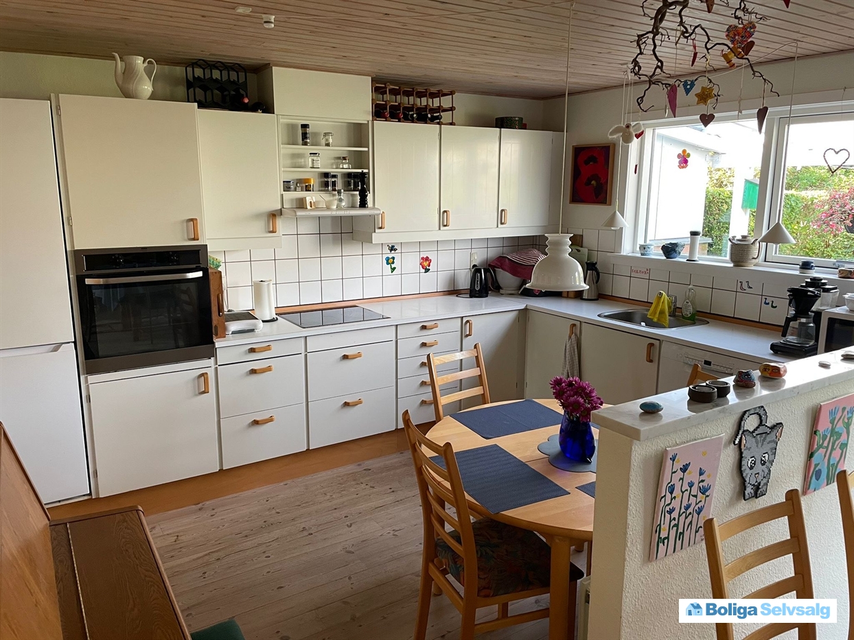 Lyst køkken i åben forbindelse med alrum og opholdsstue