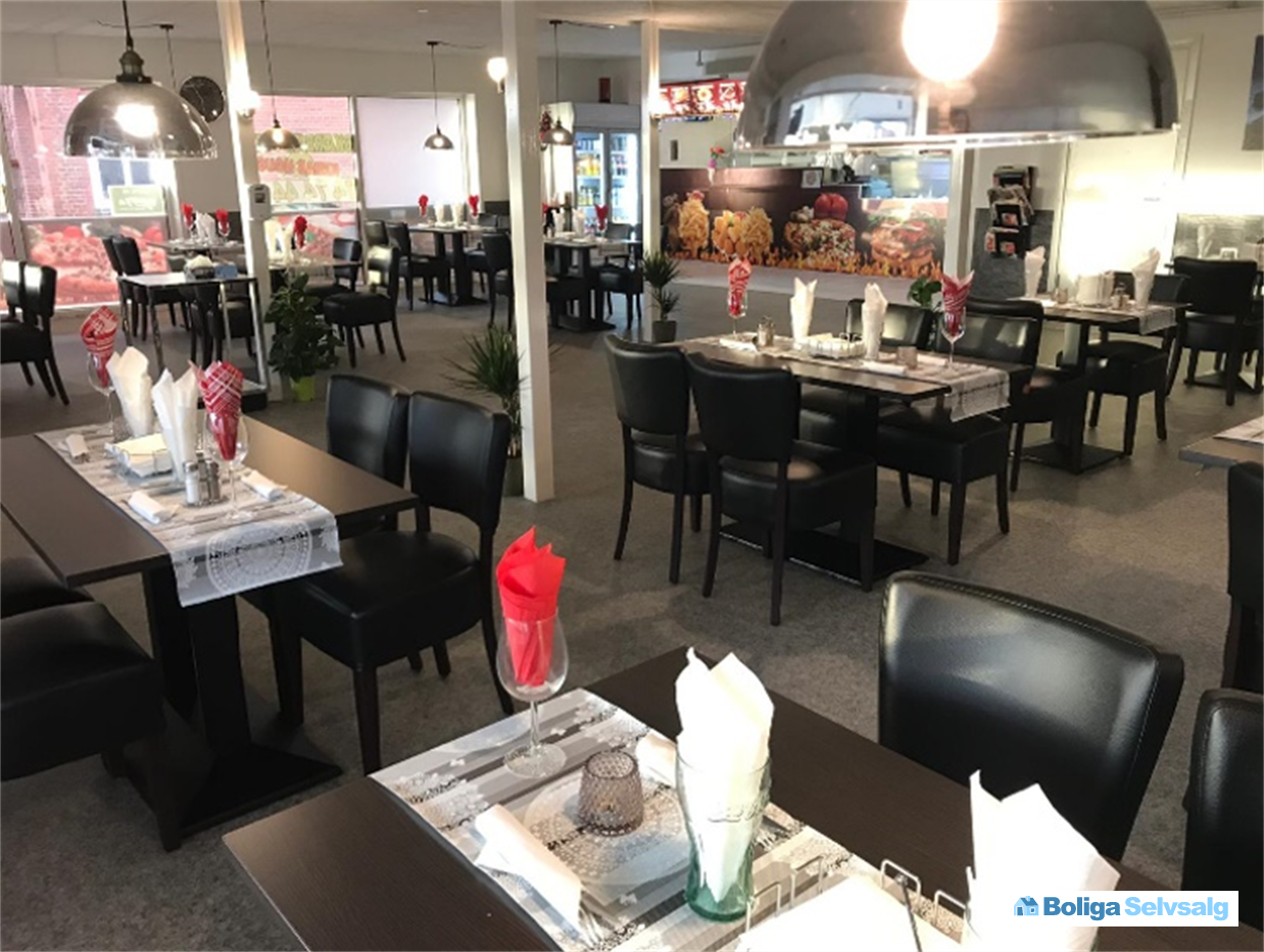 I stueetagen findes et pizzeria, men lokalet kan nemt omdannes til anden butik, café, kontor, klinik eller lignende (tidligere brugt som tøjbutik).