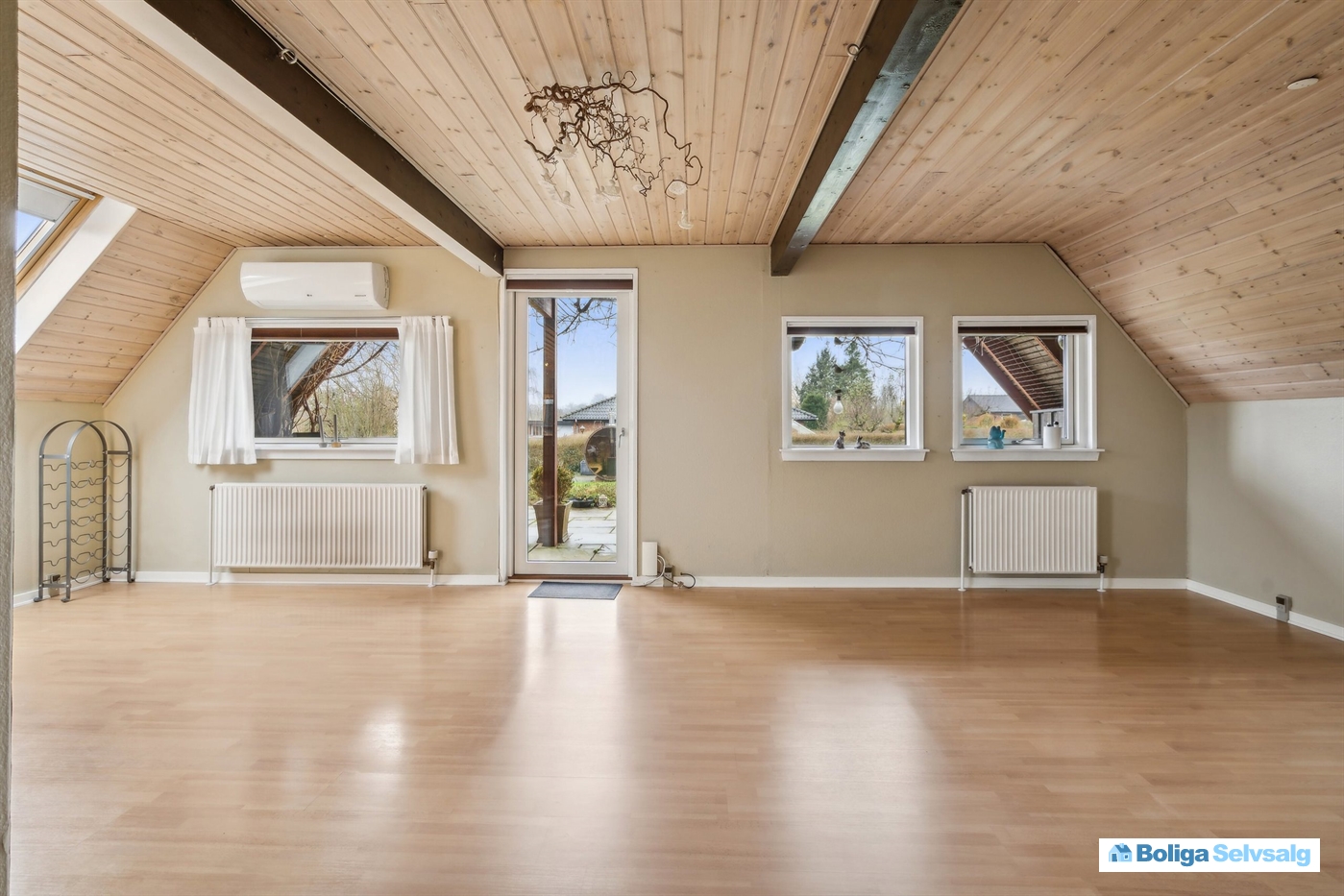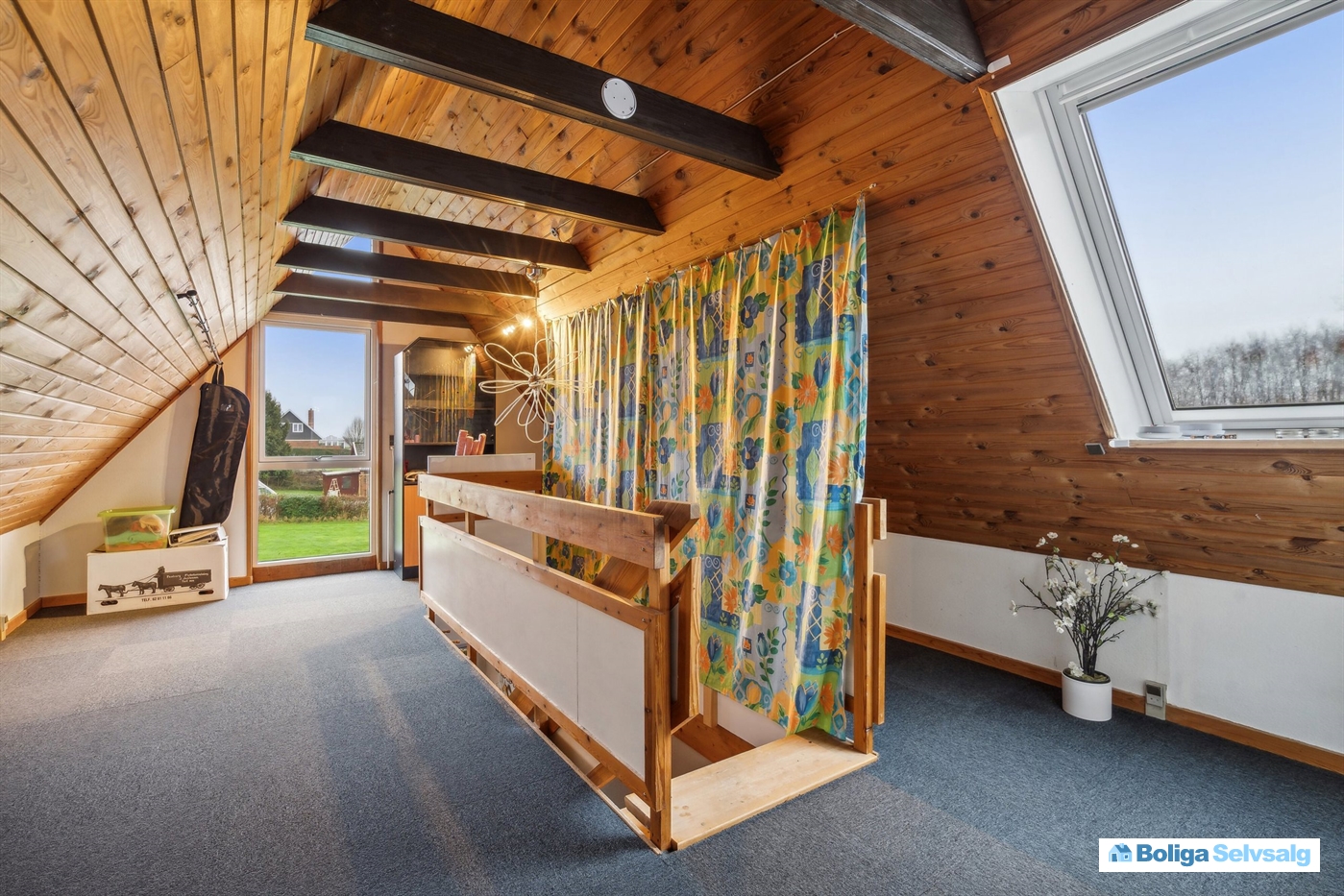 På 1. sal kommer du op til stort repos med mulighed for kontor, gæsteværelse eller opbevaring samt et skønt soveværelse med udgang til altan hvorfra der er udsigt til haven.