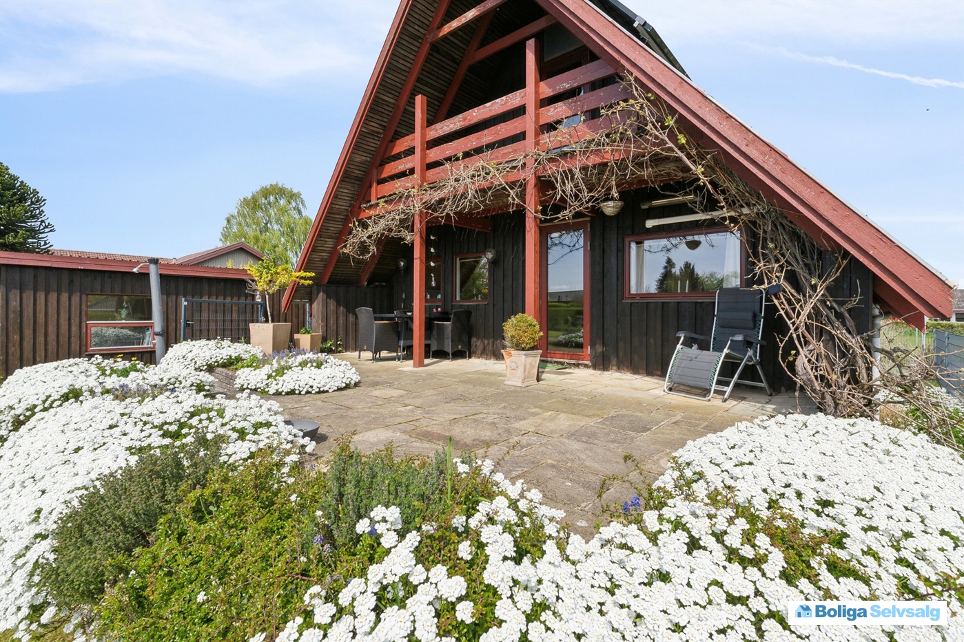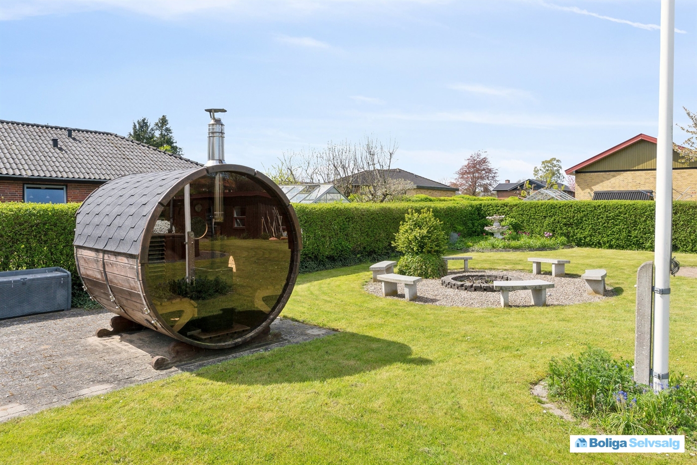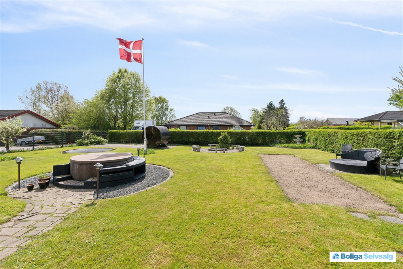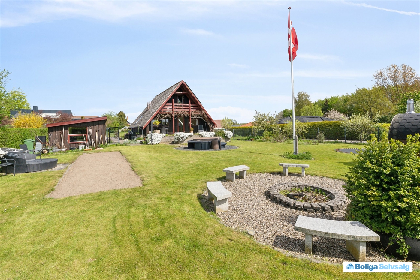 Haven er matriklens stolthed. Udover den overdækkede terrasse, finder du hyggekroge, petanquebane, bålplads, spabad, trampolin, fodboldbane/hundegård og sauna.