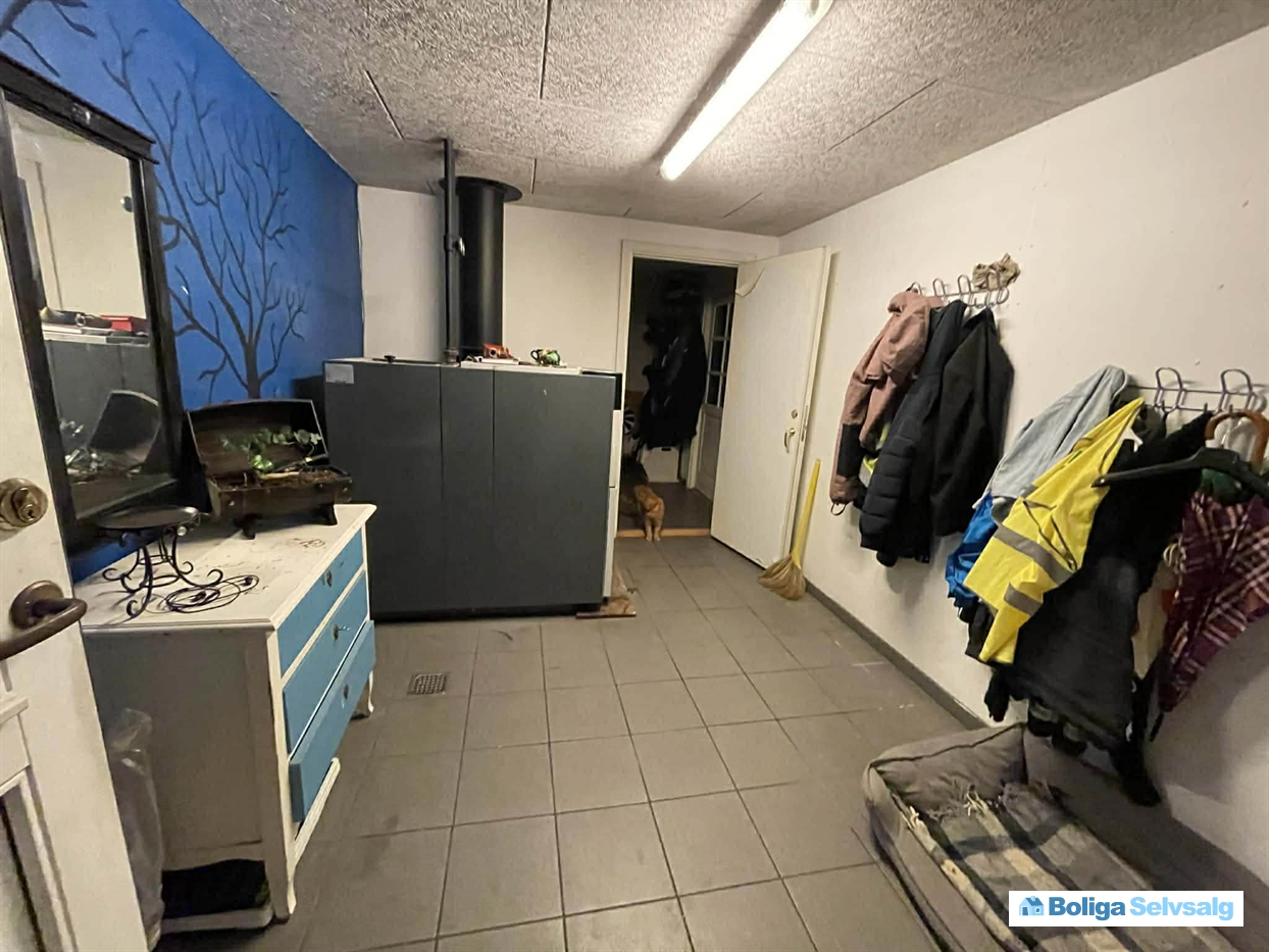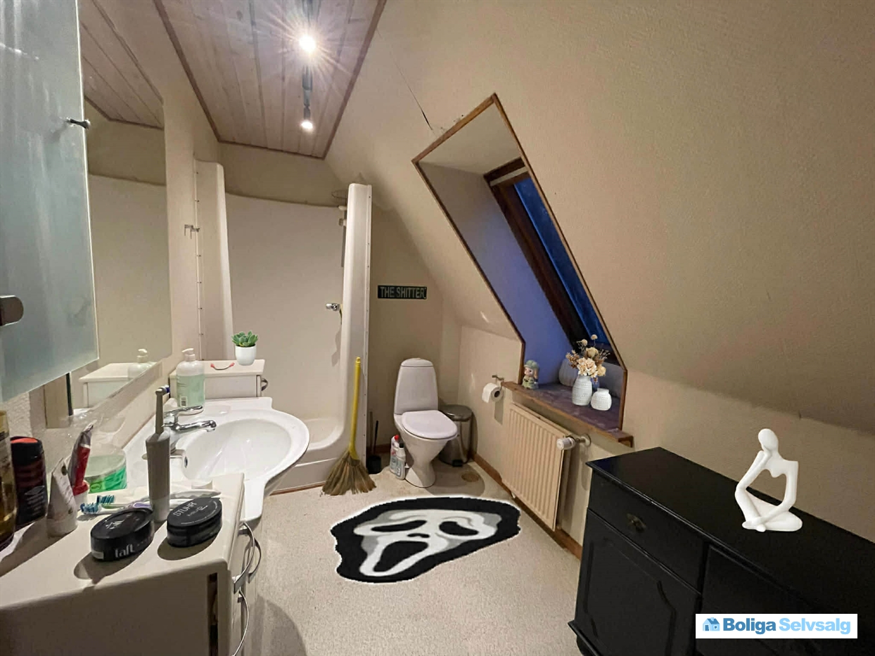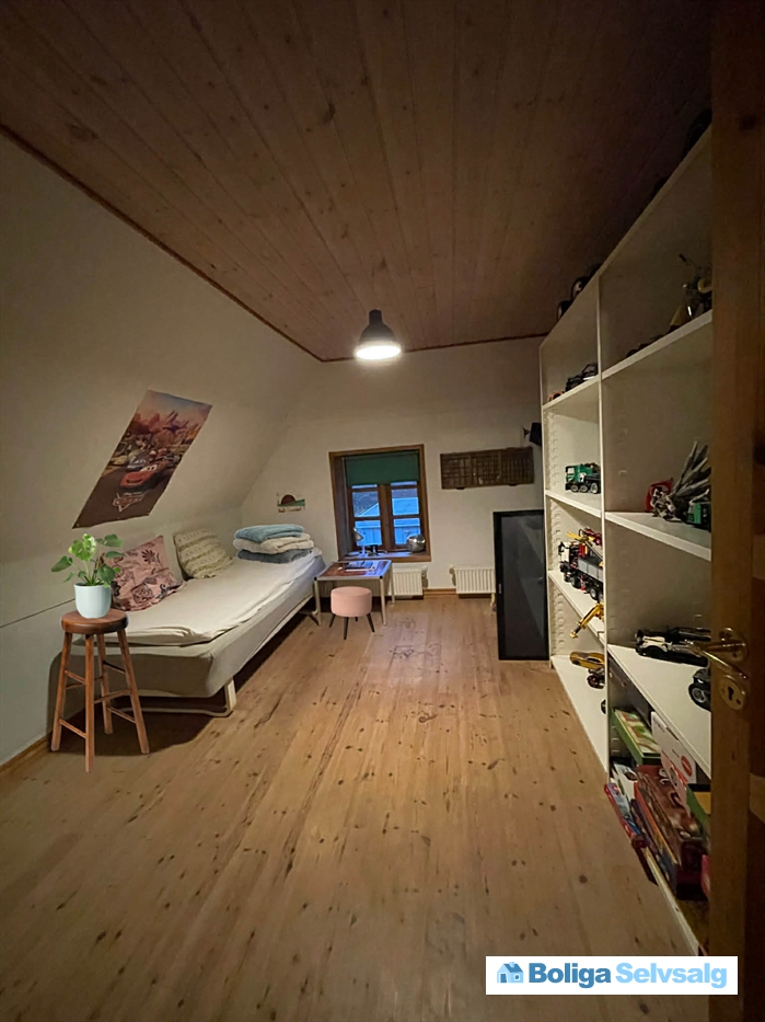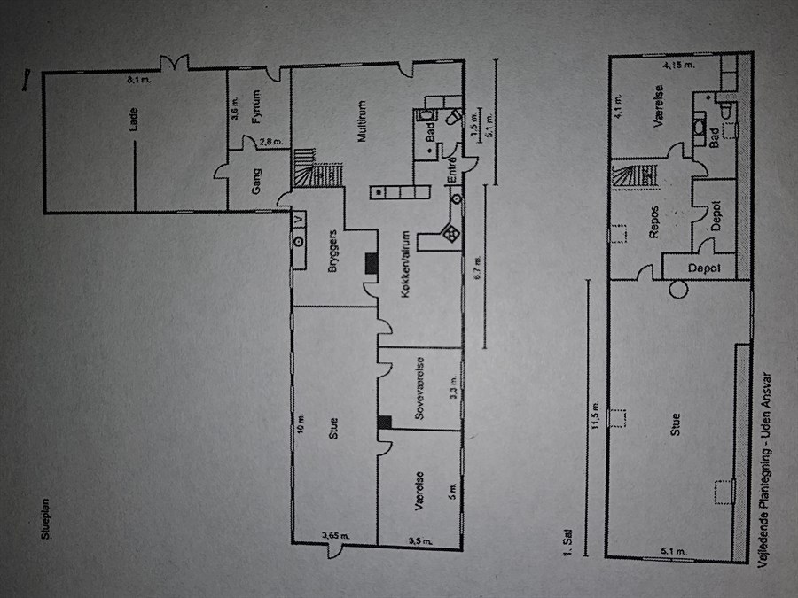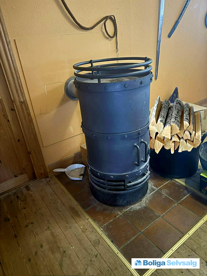 På 1. sal er repos depotrum/garderobe, badeværelse med brusekabine, værelse og stue/alrum med brændeovn, fyrretræsgulve...