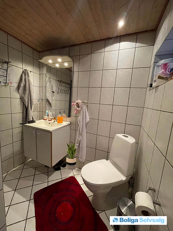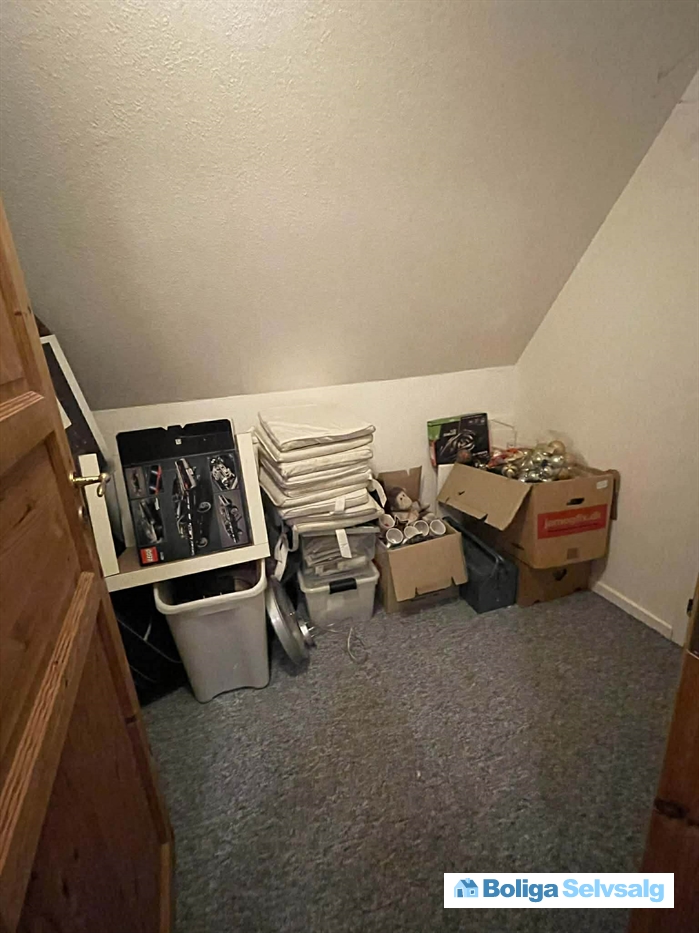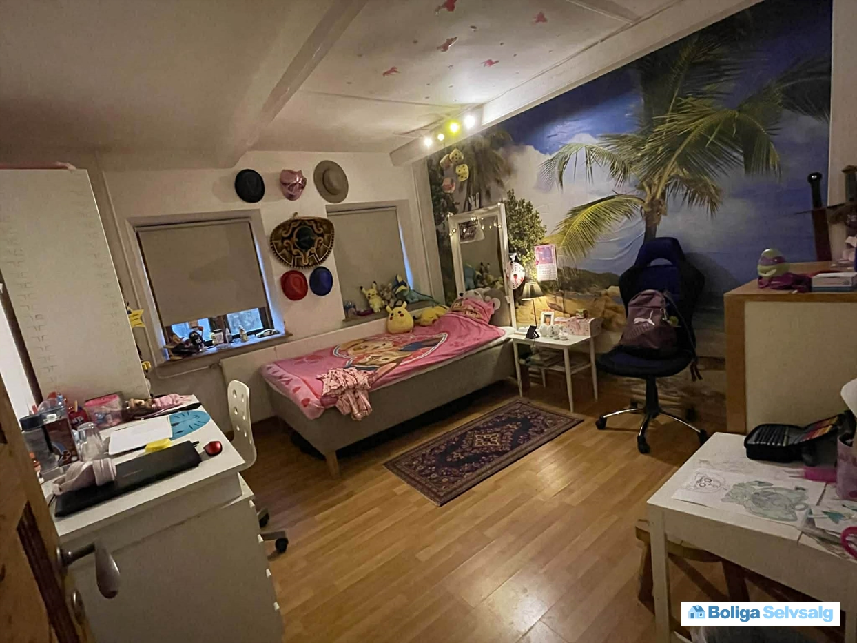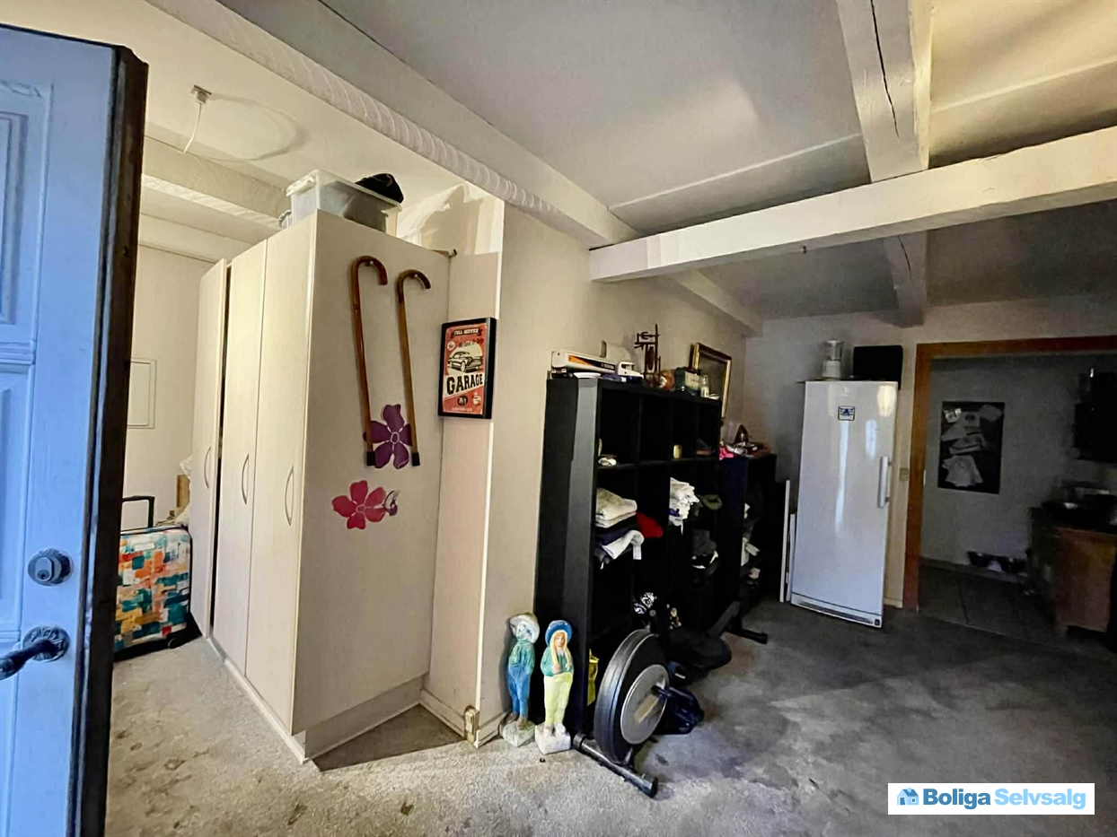 På 1. sal er repos depotrum/garderobe, badeværelse med brusekabine, værelse og stue/alrum med brændeovn, fyrretræsgulve...