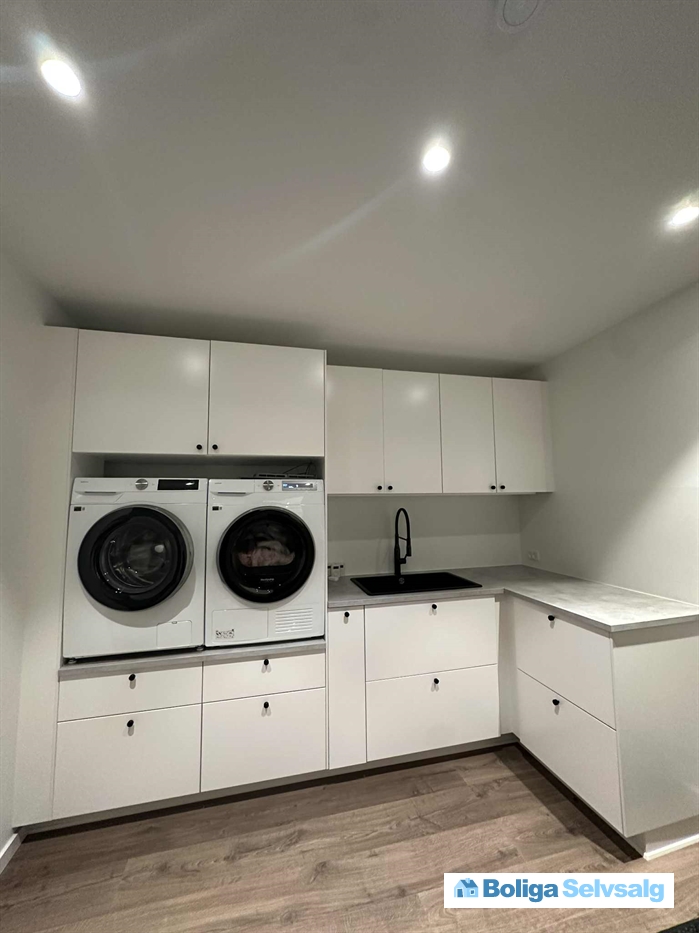 Praktisk bryggers med hævet vaskemaskine og tørretumbler