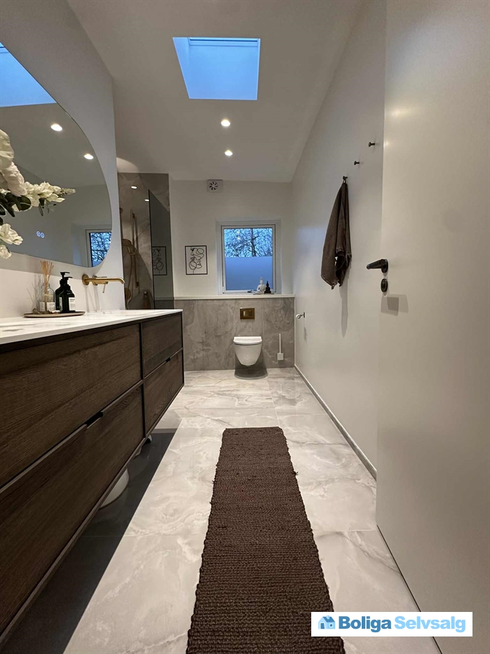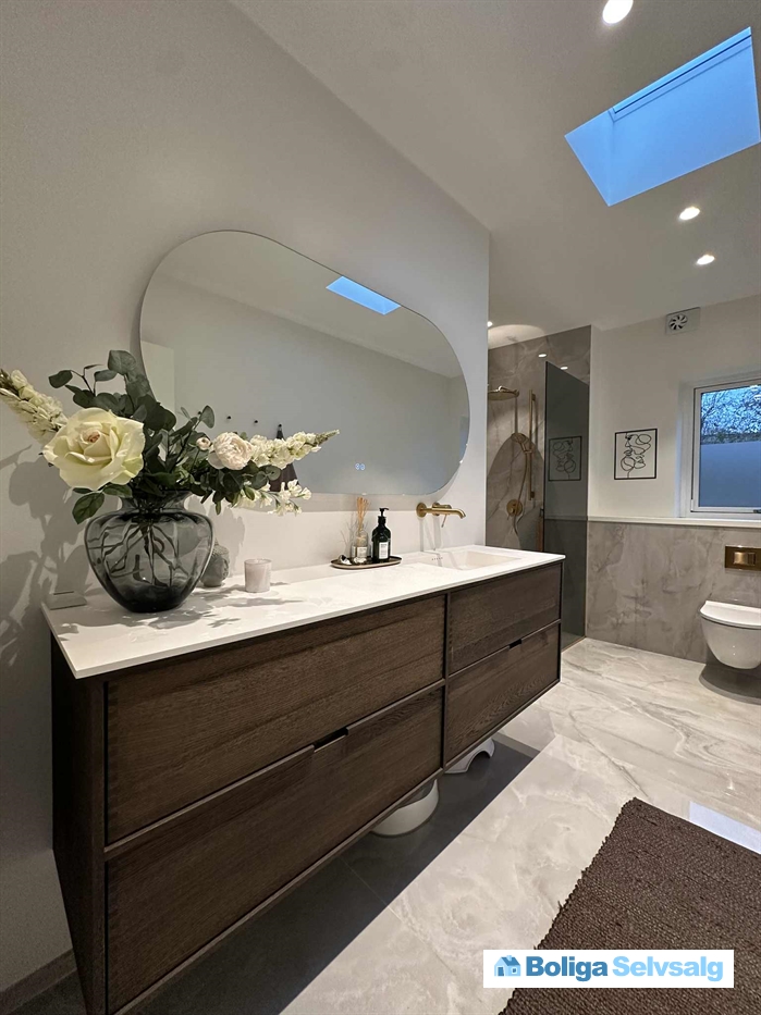 Stort eksklusivt badeværelse m. 120x120 fliser, Grohe indbygningsarmaturer i børstet messing og specialfremstillet snedkerbadmøbel
