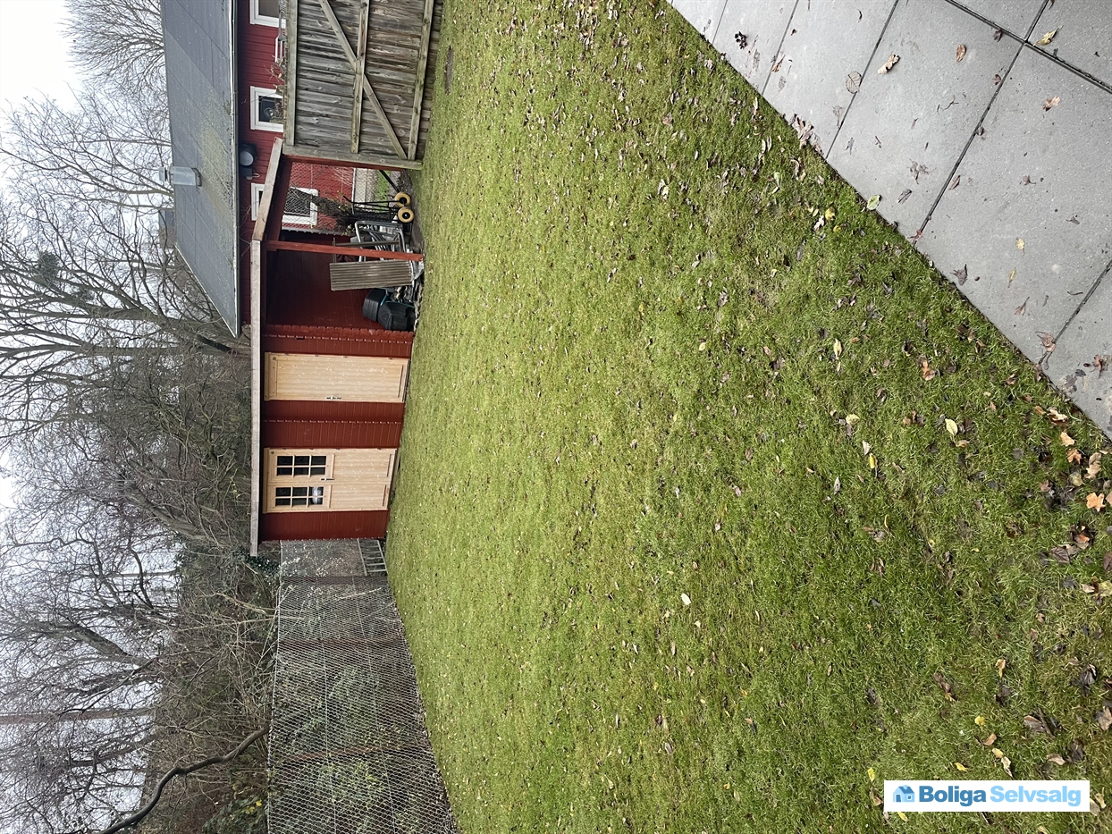 Ekstra: Nyopført skur på ca. 16 kvm med 1 stort rum med dobbeltdøre, 1 mindre rum samt en overdækning til eks. cykler