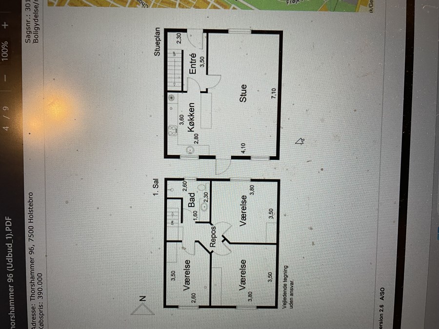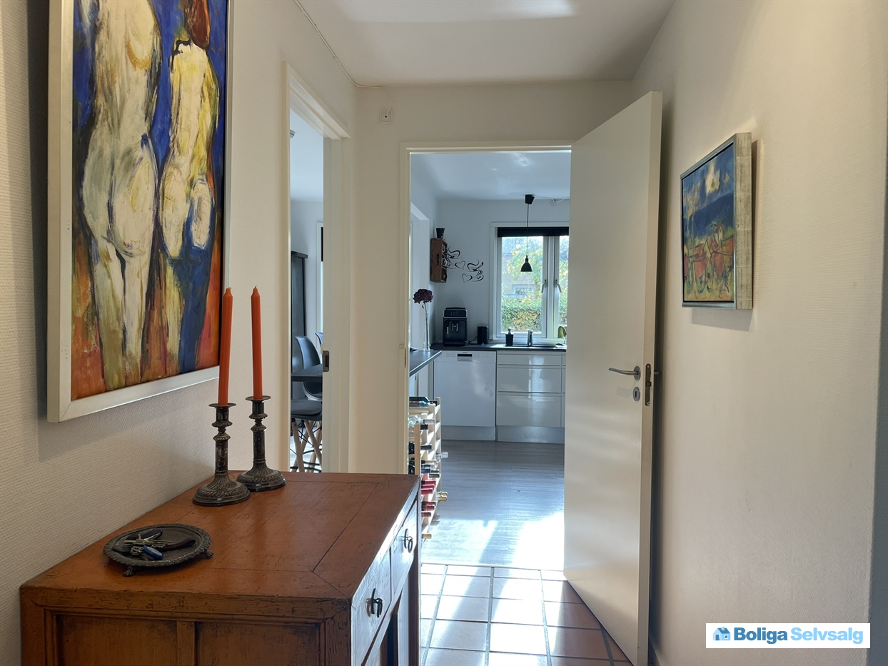 Fra entréen er der opgang til 1. sal, med et fint soveværelse og 2 gode værelser. Dejligt badeværelse med plads til vaskemaskine og tørretumbler.
