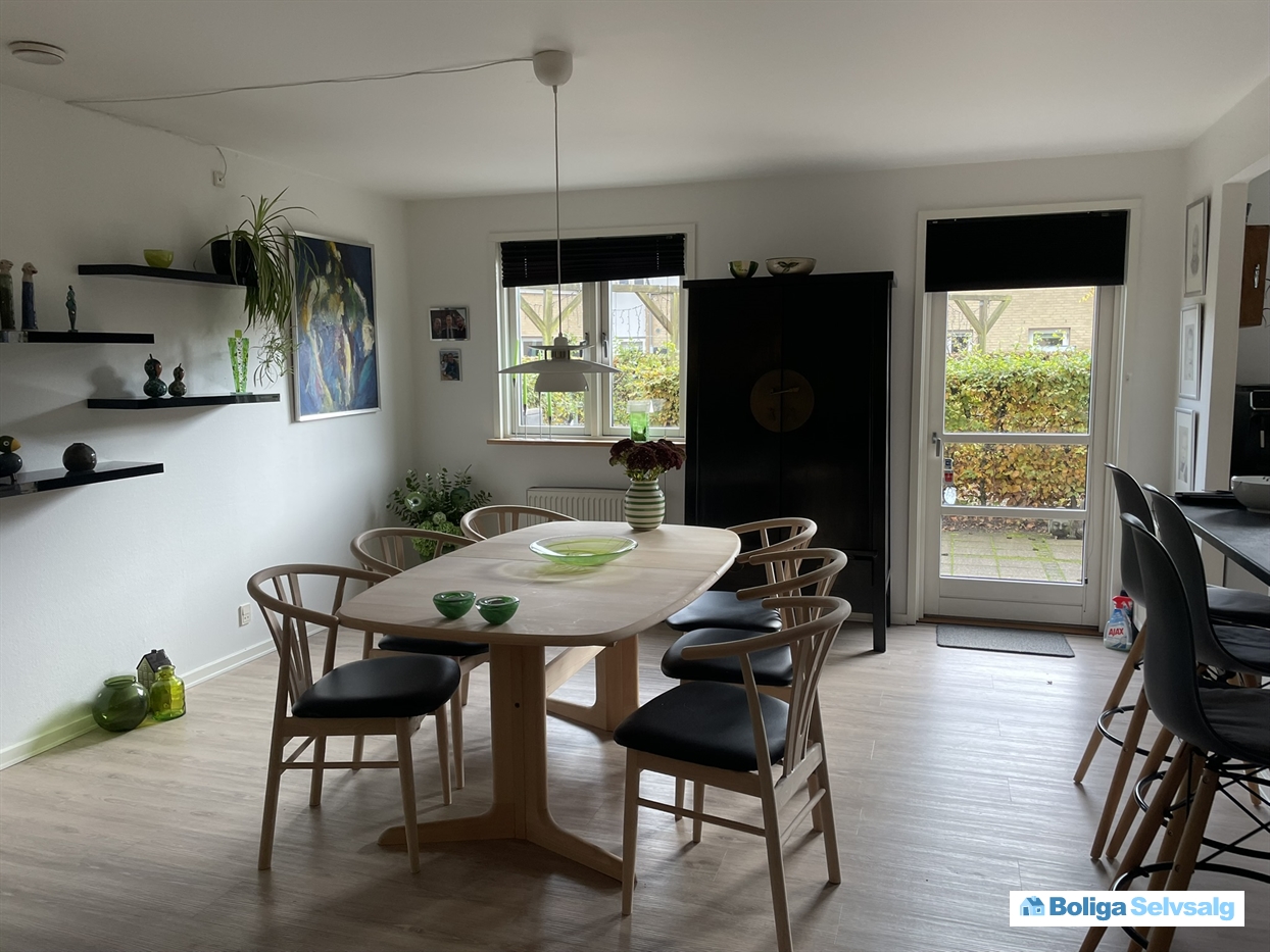 Boligen er i stueplan indrettet med entré med trappe til 1.sal. Derfra indgang til stue og køkken-alrum i ét. Dejligt rum med hyggelig atmosfære og fantastisk lysindfald. Ved køkkenet er der mulighed for ekstra bordplads i form af 2 - 3 barstole. Derudover udgang til sydvendt terrasse med sol hele dagen.