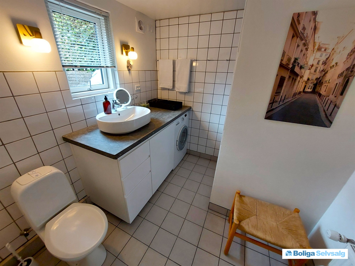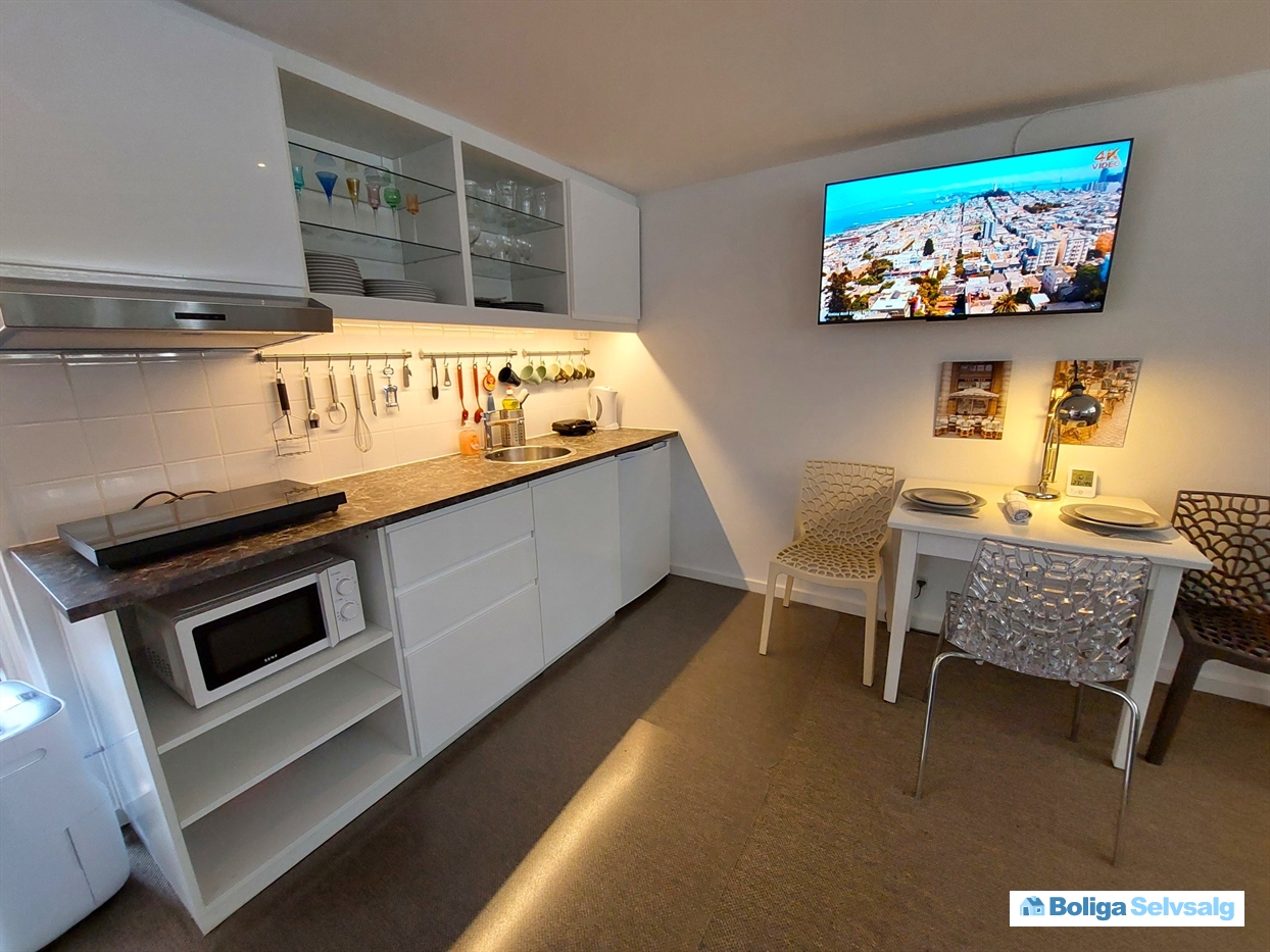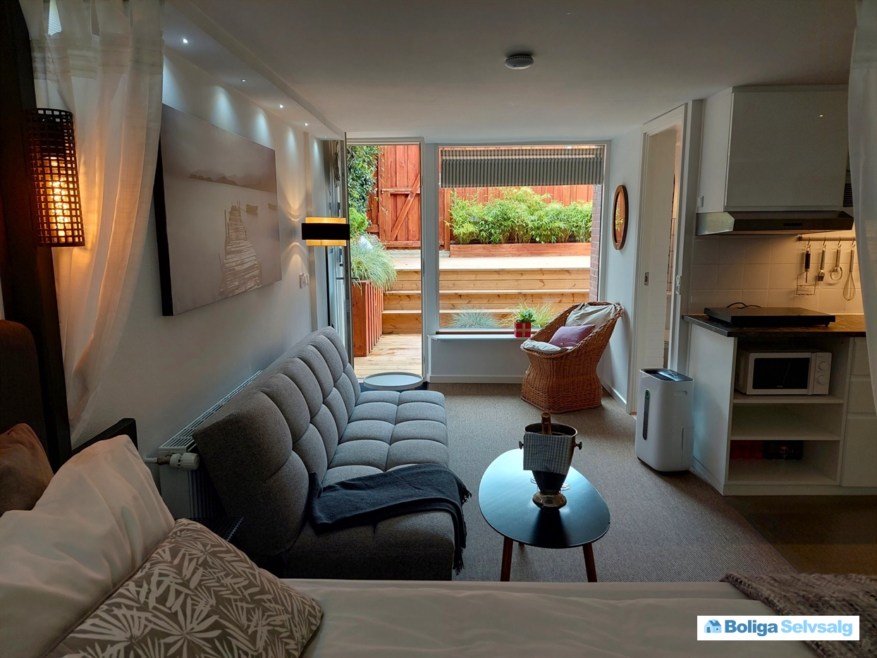 Den separate lejlighed på 34 m² er fuldt adskilt fra hovedboligen med egen indgang og egen terrasse, hvilket sikrer, at beboelse i lejlighed og hovedhus kan foregå uafhængigt af hinanden og uden gensidig gene. Lejligheden er indrettet for ca. to år siden og fremstår tidssvarende og velindrettet med opdaterede installationer. Alt fast inventar og interiør medfølger.