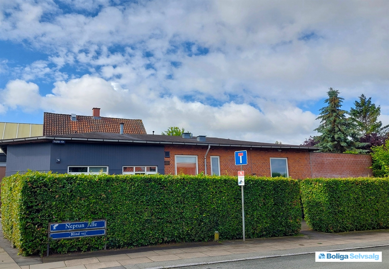 Beliggende på en stille, lukket villavej i Kastrup med et roligt boligmiljø. Løjtegårdsskole ligger 500 meter for enden af Neptun Allé, så børn nemt kan gå til skole uden at krydse veje. Der er kort afstand til indkøb, restauranter, offentlig transport, lufthavn, Øresundsbroen samt motorvejsnet og det tager ca. 20 min. på cykel til centrum af København og 10 min. til Amager Strandpark. På trods af beliggenheden i Kastrup er ejendommen ikke påvirket af flystøj, da flytrafik ikke passerer over området.