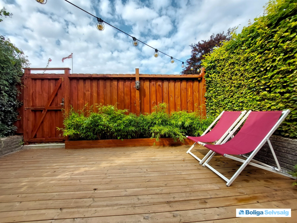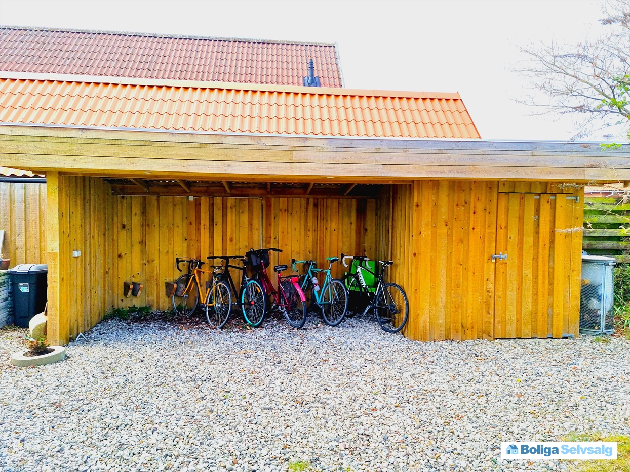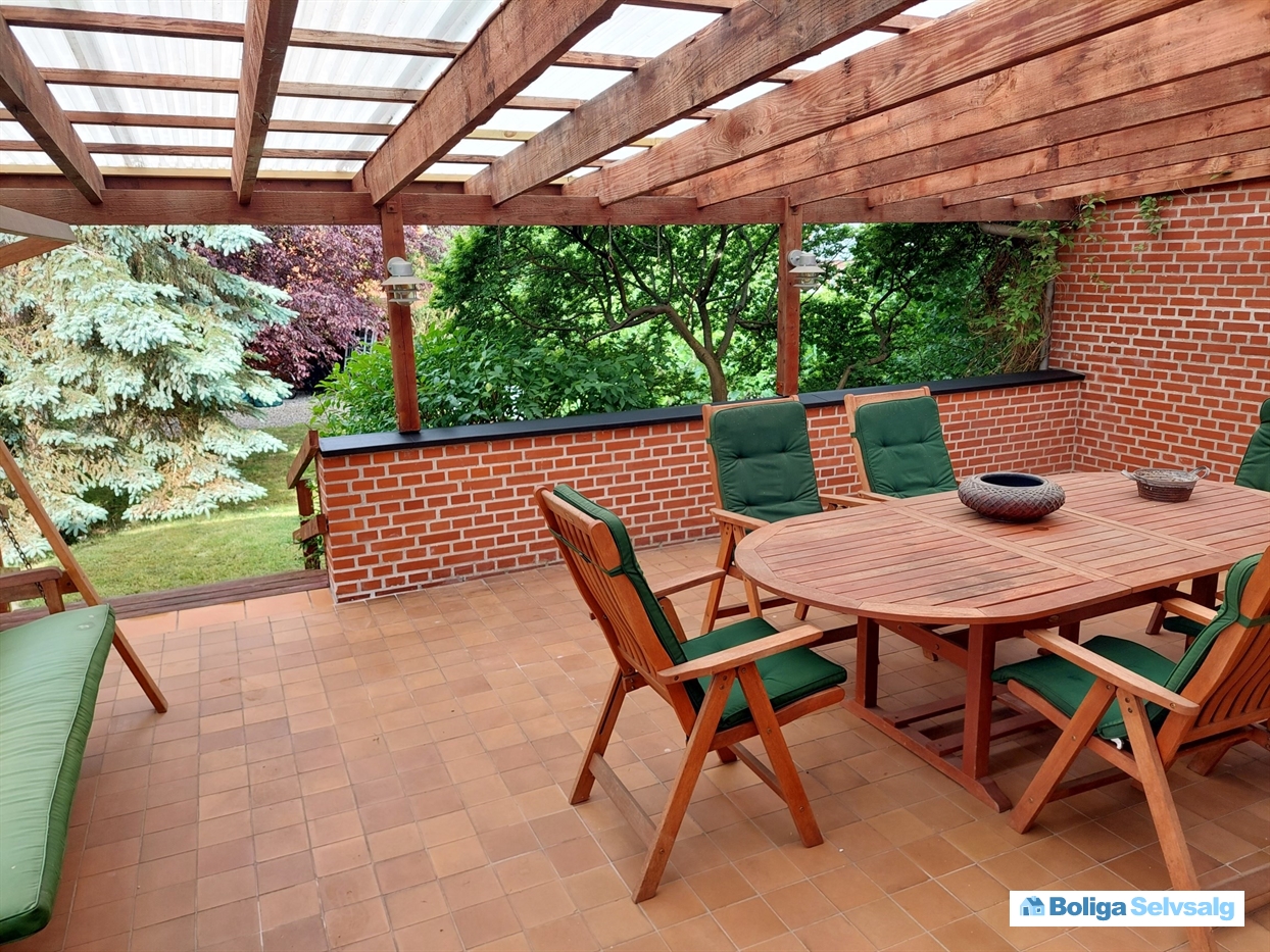 Ejendommen ligger på en 648 m² grund med syd/vestvendt lukket og velholdt have med nem vedligeholdelse. Den overdækkede terrasse giver mulighed for udendørs ophold i det meste af året. Derudover findes redskabsskur med overdækket plads til cykelparkering. Mulighed for parkering af bil, campingvogn, båd eller liggende på stenbelagt område.