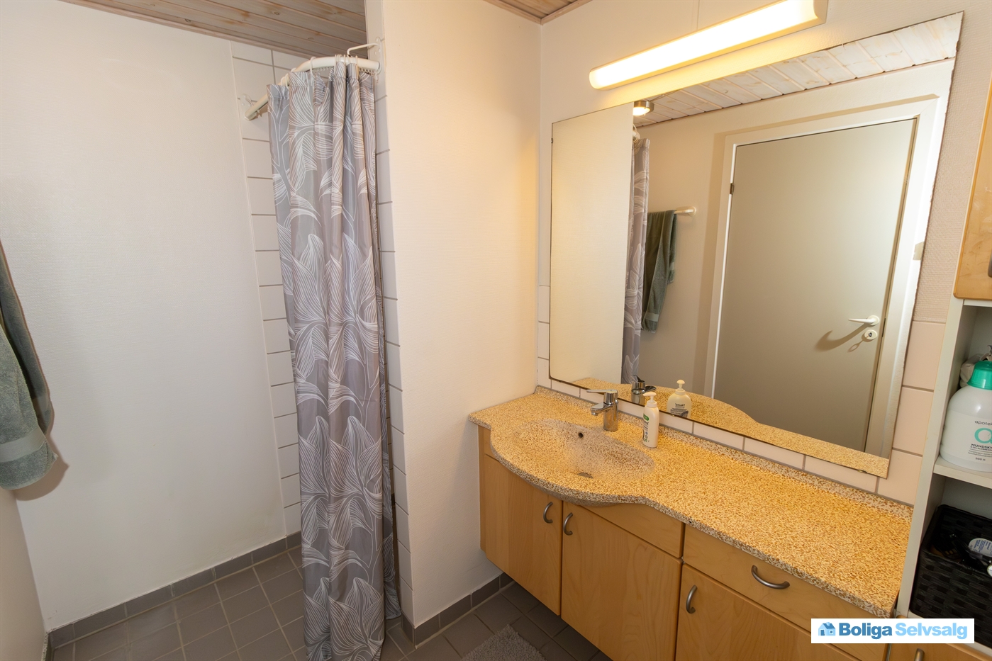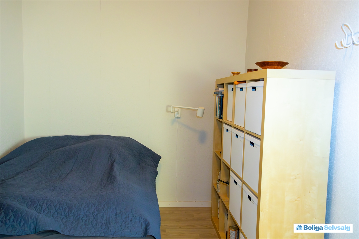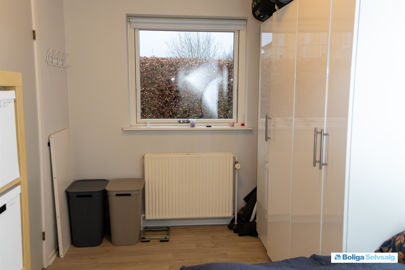 Boligen har et dejligt og praktisk badeværelse med gulvvarme og et godt soveværelse.