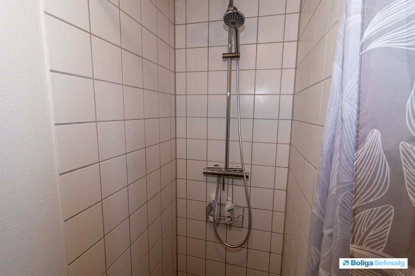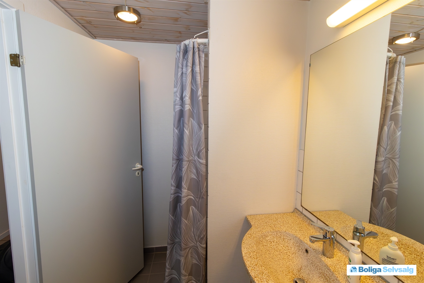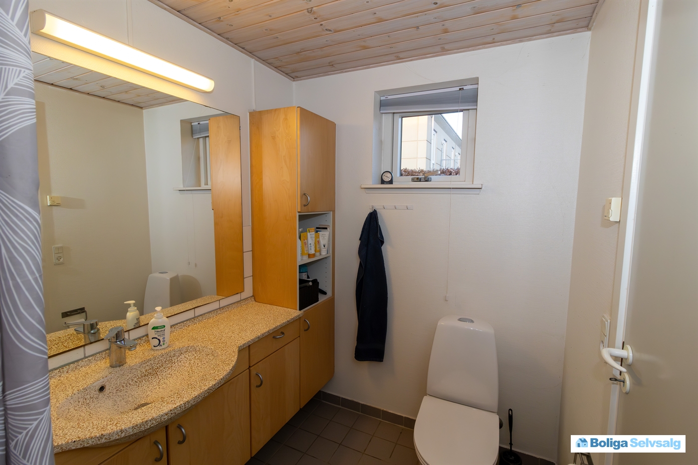 Boligen har et dejligt og praktisk badeværelse med gulvvarme og et godt soveværelse.