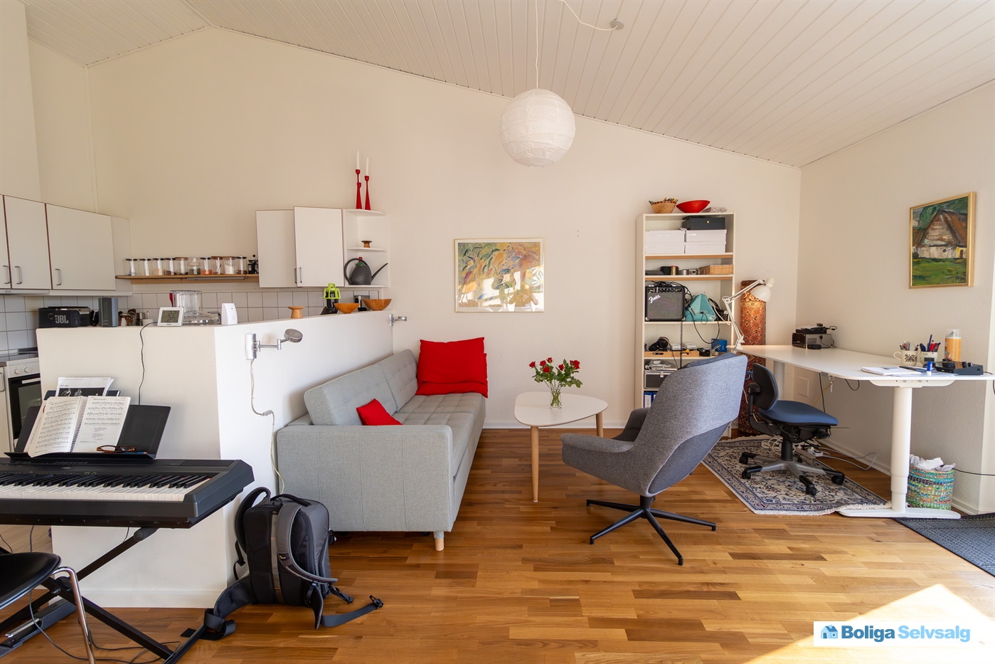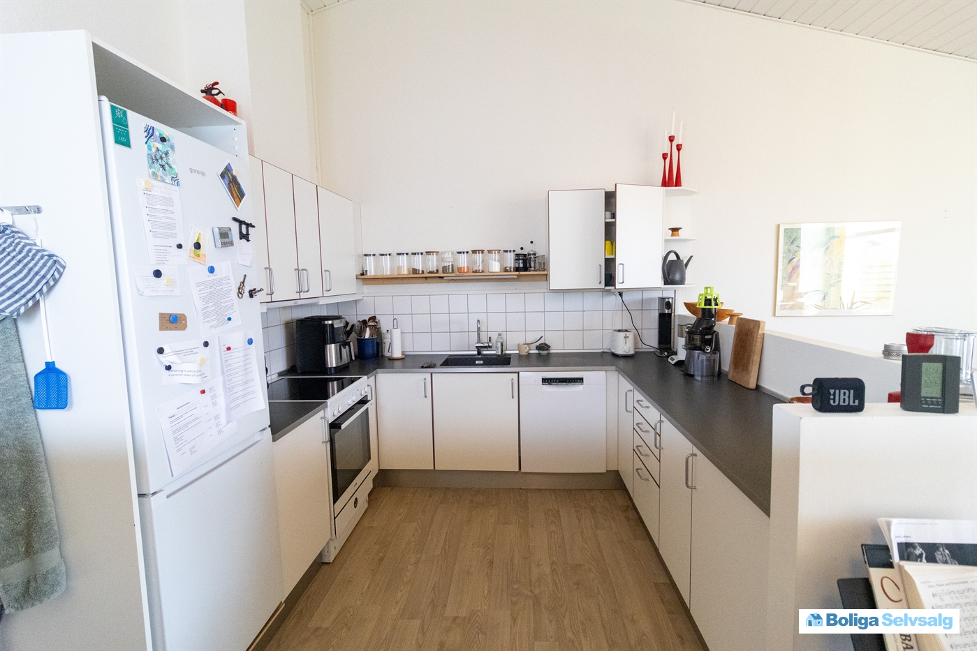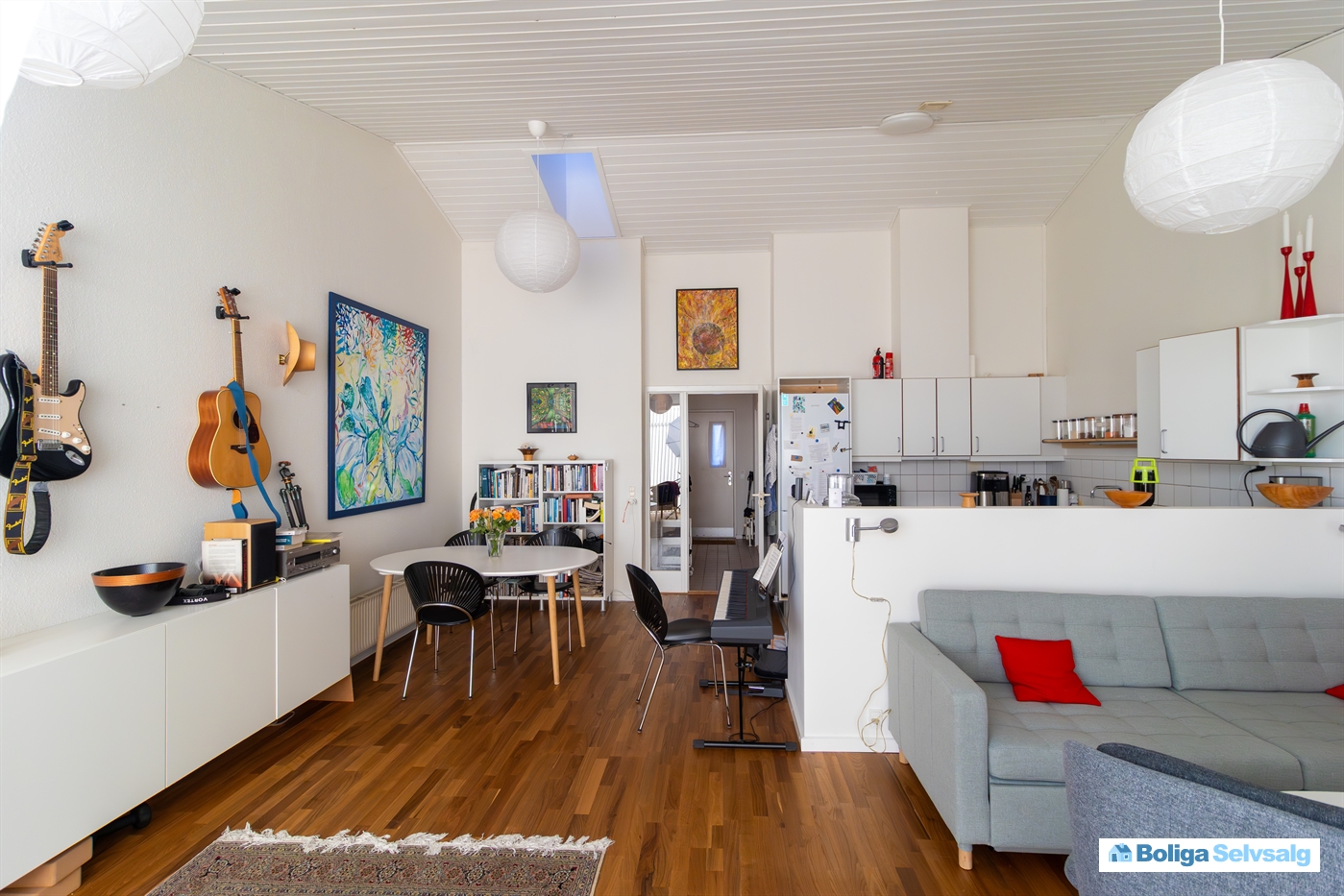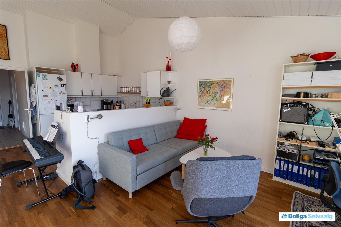 Boligen har et dejligt stort køkken i åben forbindelse med en stor, lys stue. Der er næsten loft til kip - loftshøjden er ca 3,90m hvor det er højest. Dejligt lysindfald fra store vinduer og en terassedør, samt et ovenlysvindue.