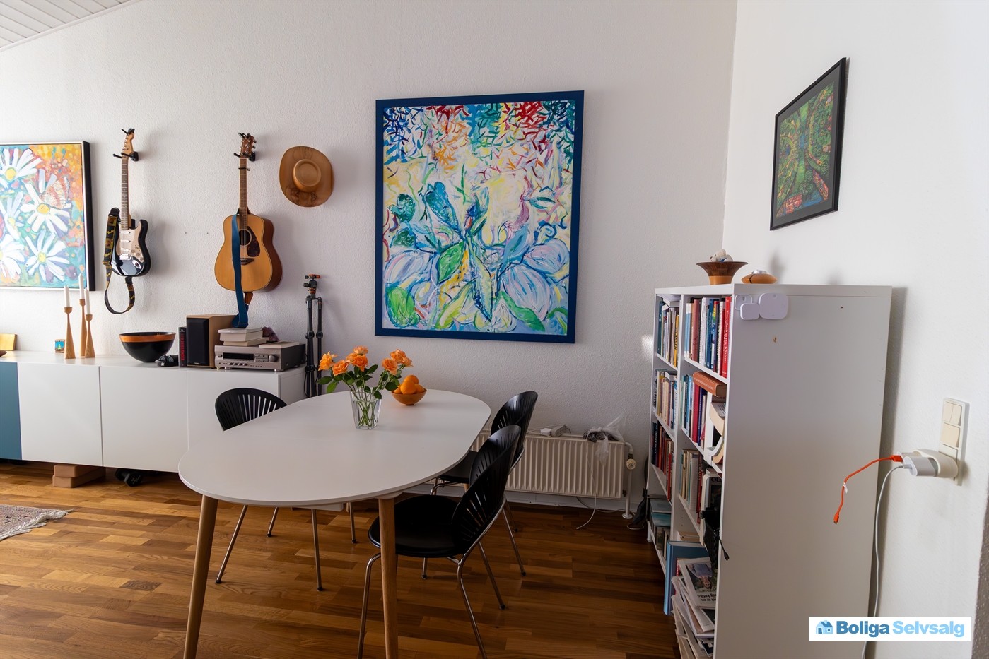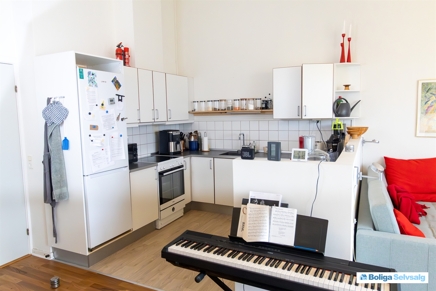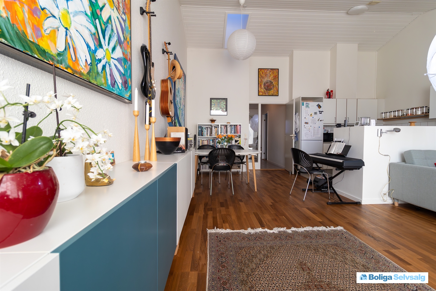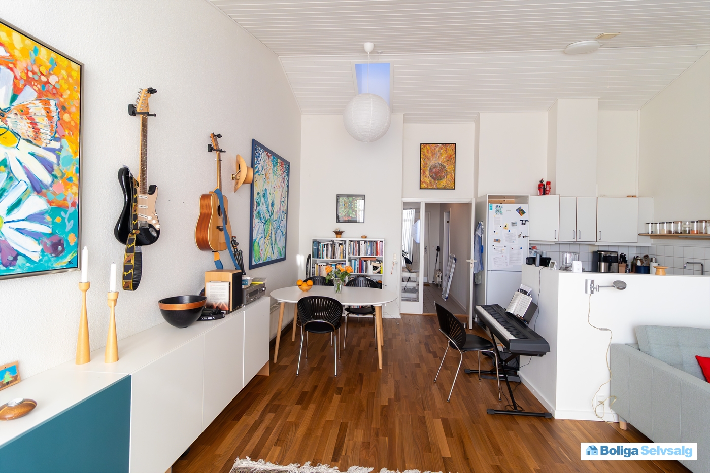Boligen har et dejligt stort køkken i åben forbindelse med en stor, lys stue. Der er næsten loft til kip - loftshøjden er ca 3,90m hvor det er højest. Dejligt lysindfald fra store vinduer og en terassedør, samt et ovenlysvindue.