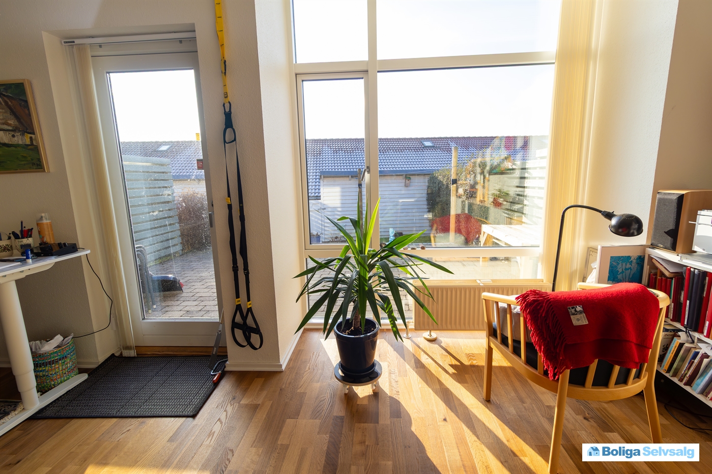 Stuen vender mod syd og lige uden for ligger en dejlig lille terasse med to små bede - nemt at holde.