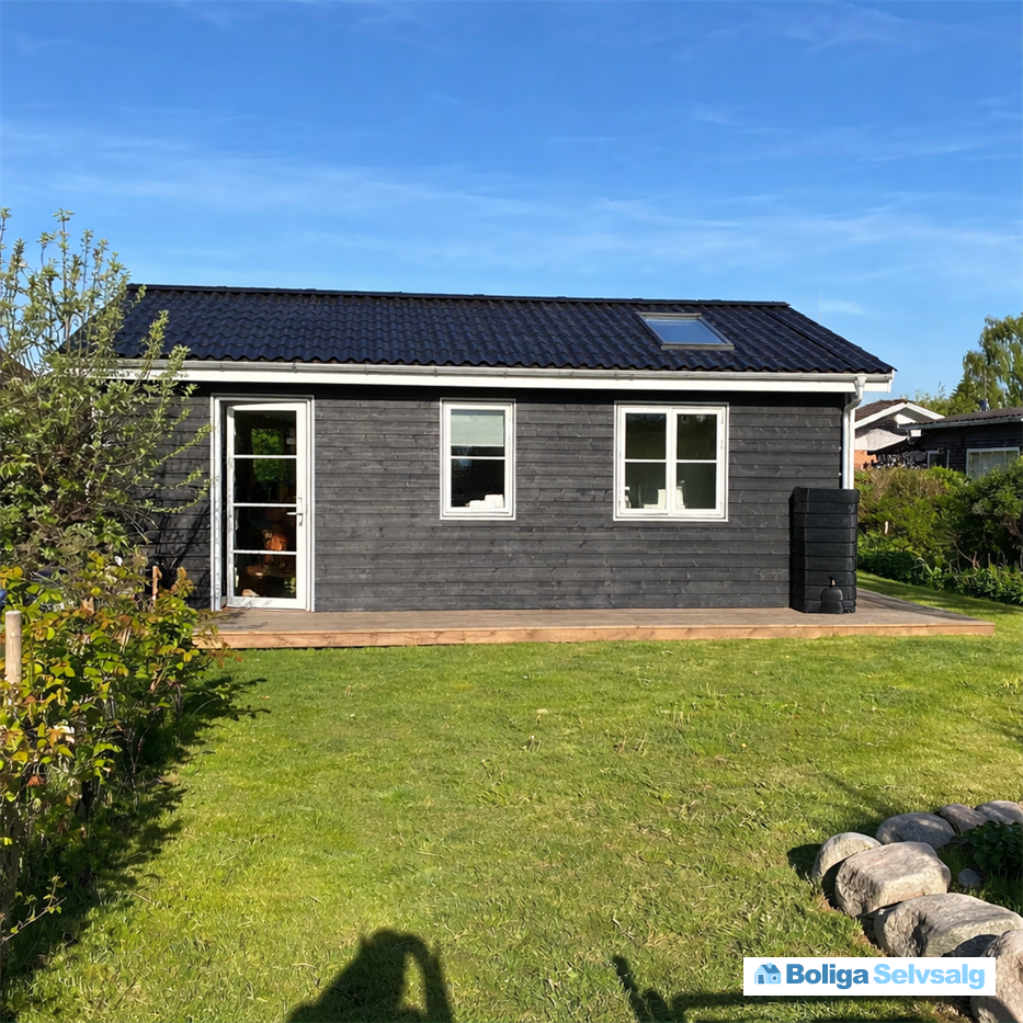 Der er el-gulvvarme på badeværelset og luft-luft-varmepumpe, som hurtigt varmer huset op. To gode værelser (det ene med ovenlysvindue), et stort bad/toilet med brus samt kombineret vaskemaskine og tørretumbler. Husets helt store samlingspunkt er et lyst og højloftet køkken-alrum med vinduer mod øst, syd og vest. Ovenpå det ene værelse er en brugbar hems. Fra køkken-alrummet er der direkte udgang til drivhus. Hele huset er omkranset af en stor træterrasse. Forhaven rummer blomster, bærbuske, et gammelt æbletræ samt to nyplantede frugttræer (kirsebær og blomme). Ligeledes parkeringsplads med perlesten på grunden. Den mere private baghave har lige nu en stor trampolin (kan evt følge med ved salg), en enorm syrenbusk, et højbed samt en udendørsbruser.
