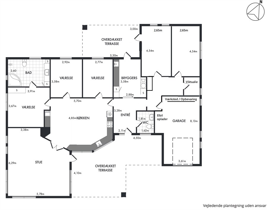 En integreret isoleret garage med plads til mindre værksted, med elport og installeret elbil-oplader - praktiske enkelt og fremtidssikret.