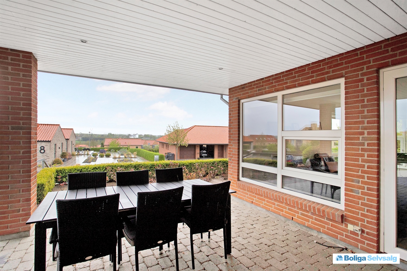 Udendørs er haven velanlagt med to overdækkede terrasse områder - et sydvendt for smukt udsyn, hvor man kan nyde morgenkaffe med udsigt, samt det nordvestlige til aftenhyggen, som byder på ekstra fred og privatliv - samt grøn plæne til leg og afslapning.