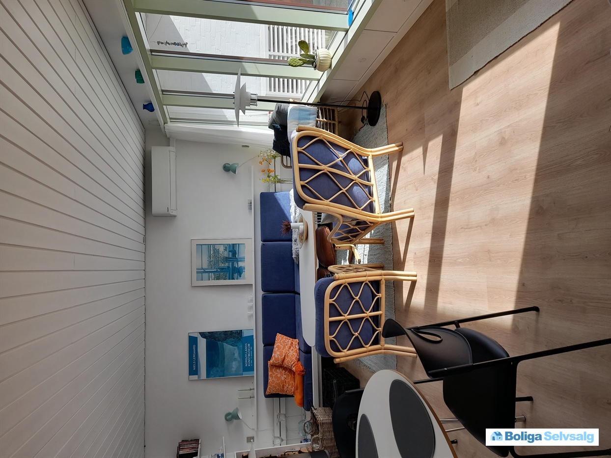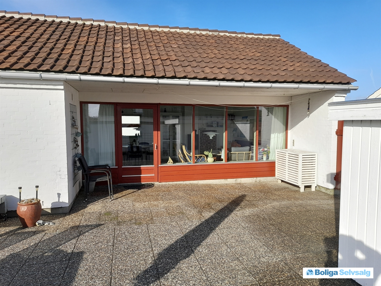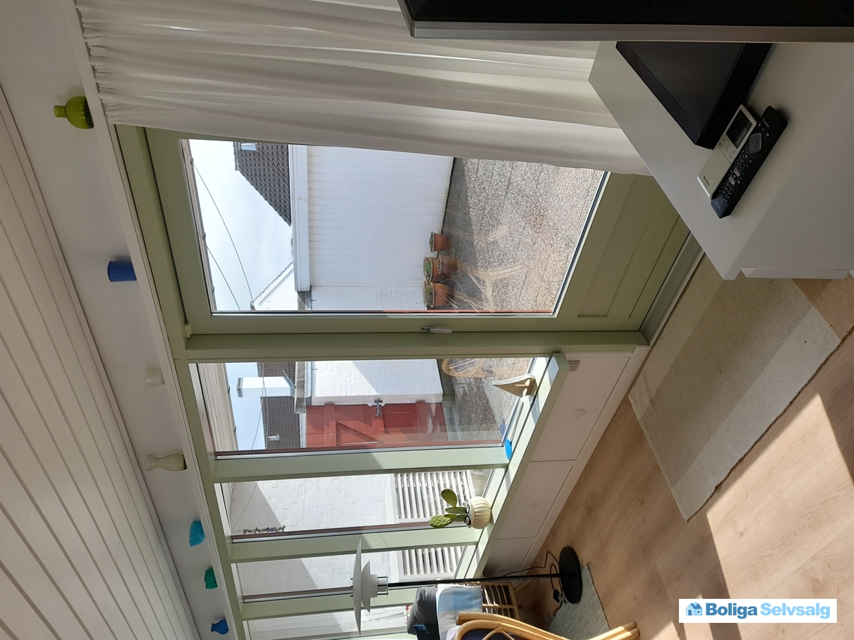 Huset byder på store vinduer mod syd og terrassedøren fører ud til en lukket og ugeneret gårdhave.