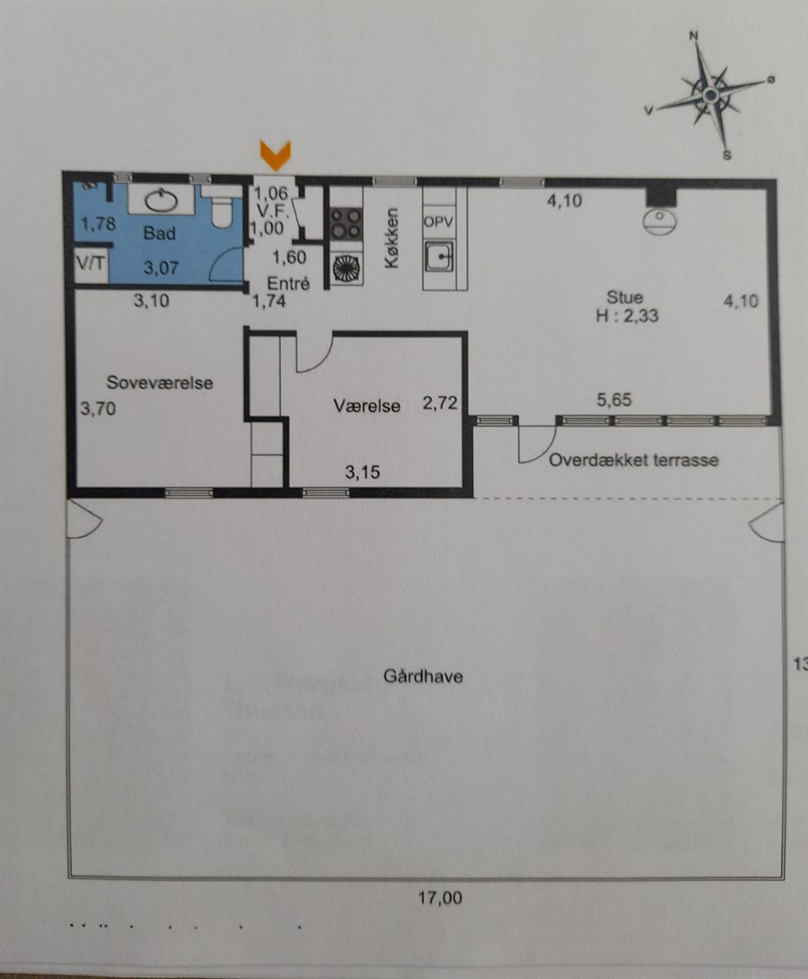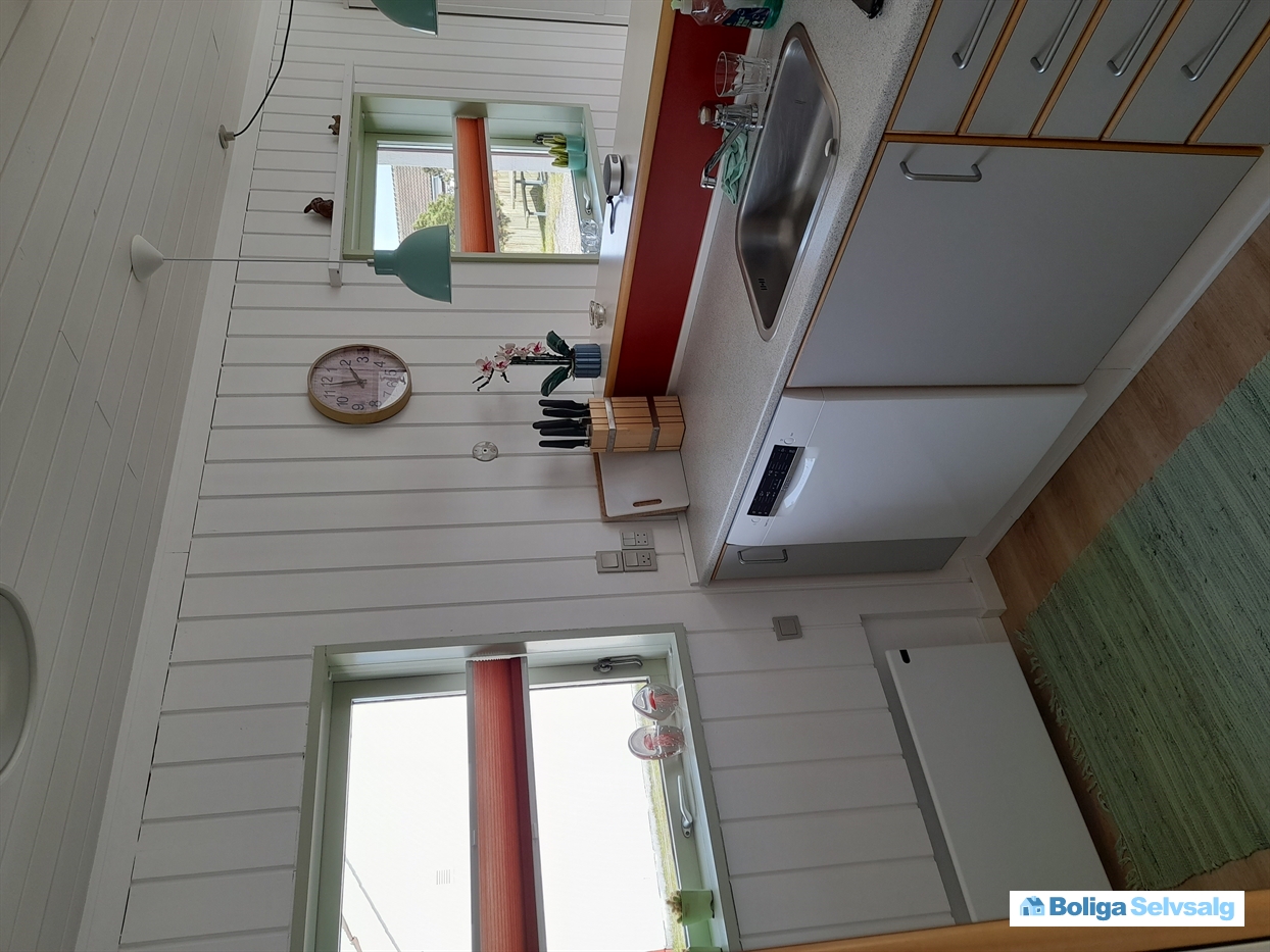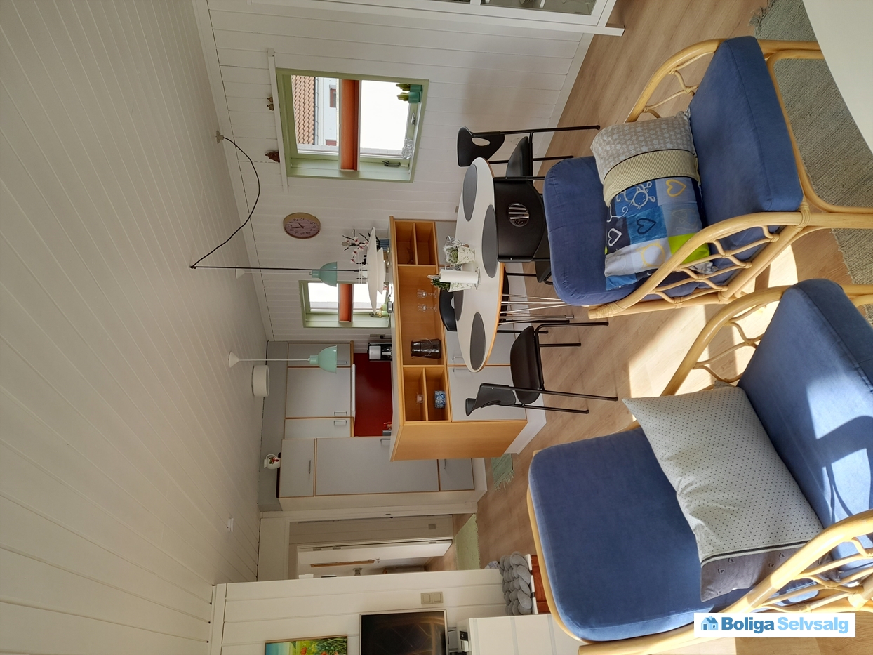 Huset byder på store vinduer mod syd og terrassedøren fører ud til en lukket og ugeneret gårdhave.