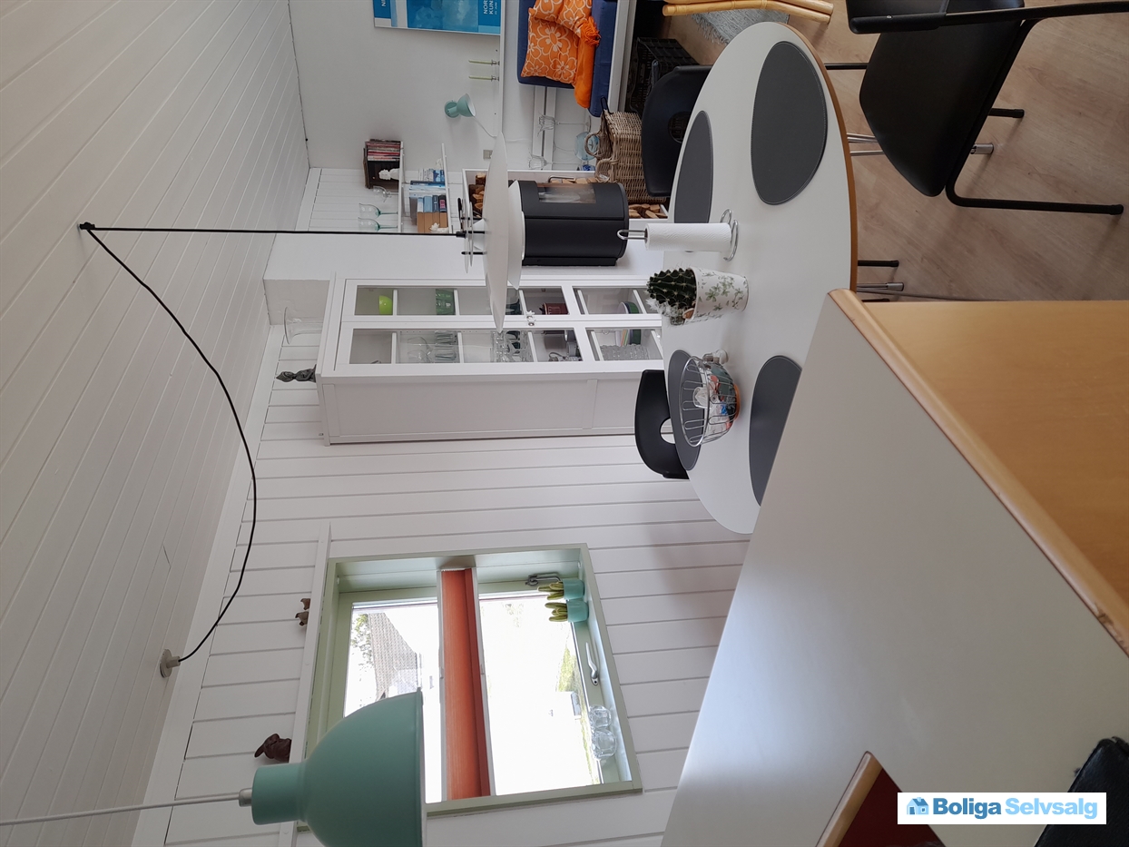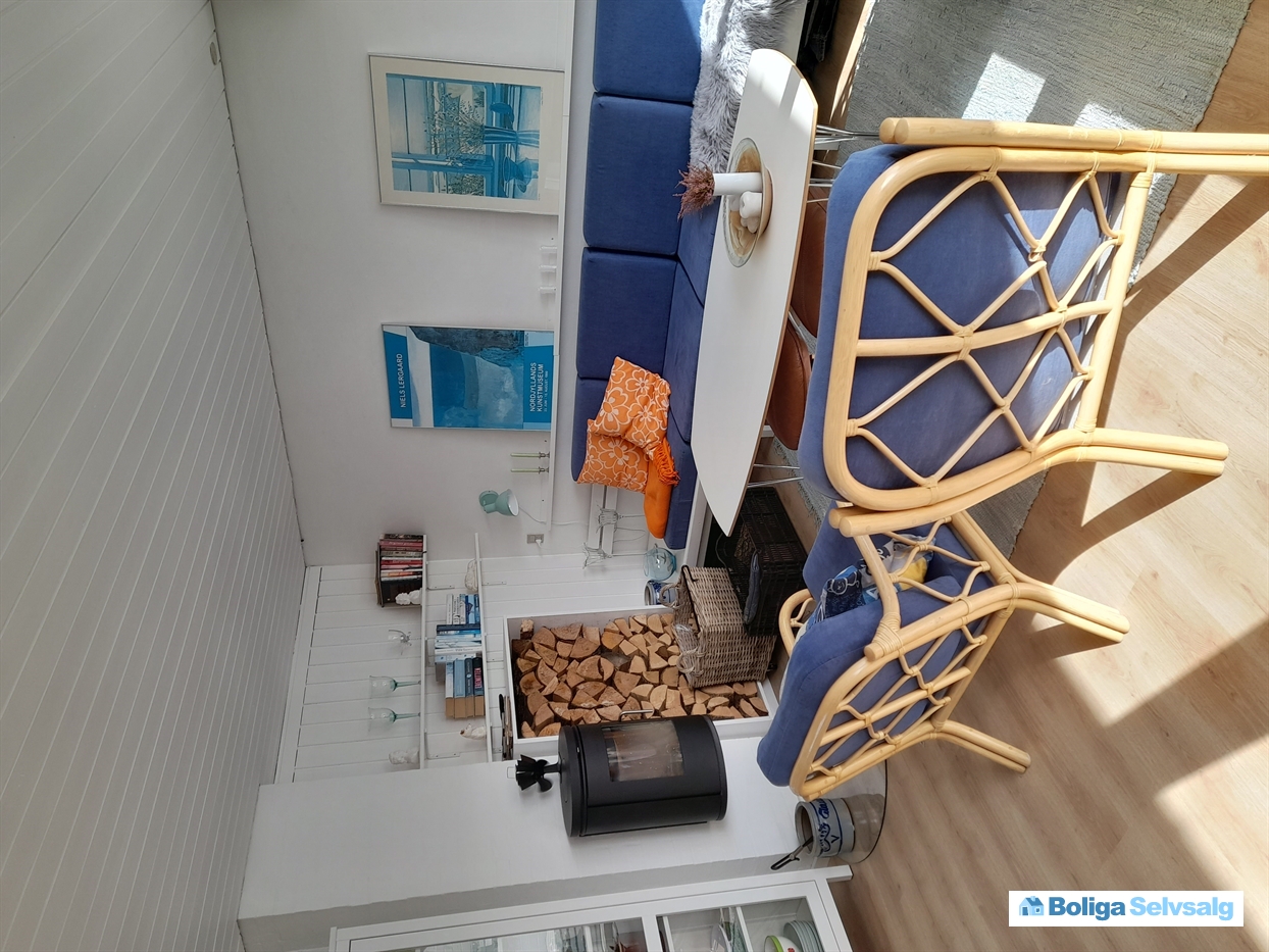 Stuen er indrettet med nyere Morsø brændeovn og nyere Panasonic varmepumpe, der kan styres hjemmefra via en APP.