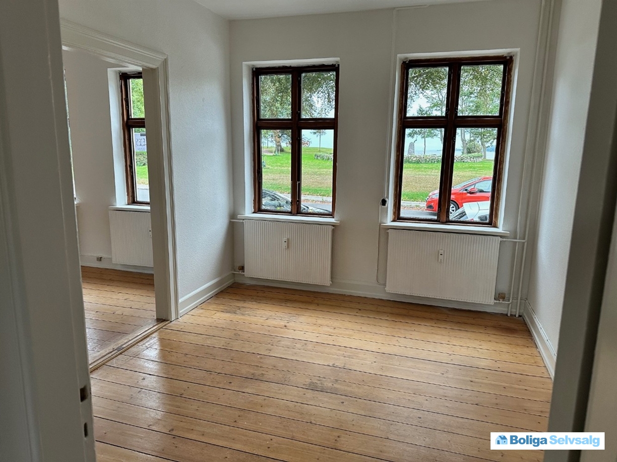 5 minutters gang til havnen, busstationen og indkøb. Park med gangstier lige foran ejendommen og en asfalteret sti langs vandet (Langelinje) der mod øst fører til en fin sand badestrand og mod vest til havnen. Der er fri parkering på Østerbrogade.